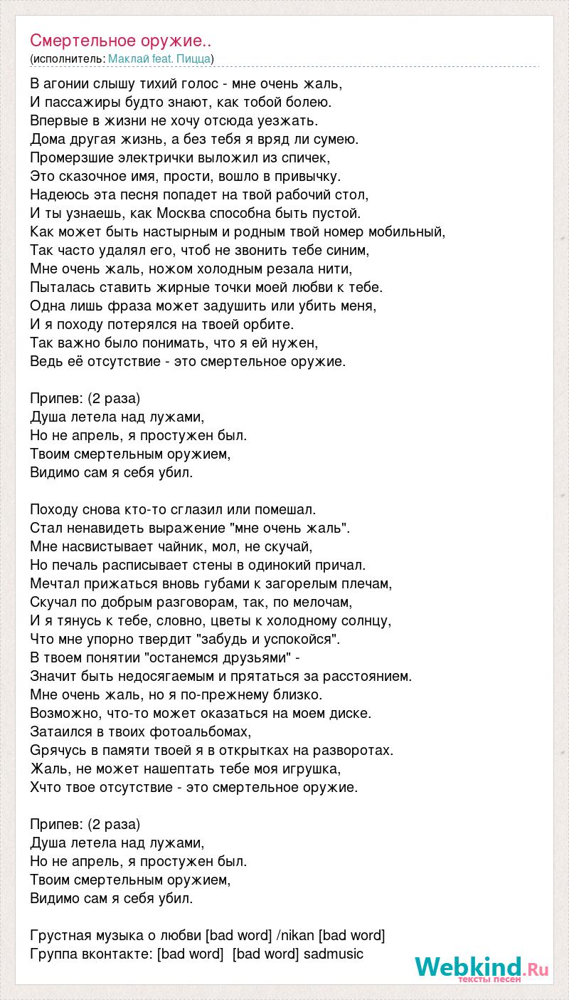 В агонии слышу тихий голос - мне очень жаль, И пассажиры будто знают, как тобой болею. Впервые в жизни не хочу отсюда уезжать. Дома другая жизнь, а без тебя я вряд ли сумею. Промерзшие электрички выложил из спичек, Это сказочное имя, прости, вошло в привычку. Надеюсь эта песня попадет на твой рабочий стол, И ты узнаешь, как Москва способна быть пустой. Как может быть настырным и родным твой номер мобильный, Так часто удалял его, чтоб не звонить тебе синим, Мне очень жаль, ножом холодным резала нити, Пыталась ставить жирные точки моей любви к тебе. Одна лишь фраза может задушить или убить меня, И я походу потерялся на твоей орбите. Так важно было понимать, что я ей нужен, Ведь её отсутствие - это смертельное оружие. Припев: (2 раза) Душа летела над лужами, Но не апрель, я простужен был. Твоим смертельным оружием, Видимо сам я себя убил. Походу снова кто-то сглазил или помешал. Стал ненавидеть выражение "мне очень жаль". Мне насвистывает чайник, мол, не скучай, Но печаль расписывает стены в одинокий причал. Мечтал прижаться вновь губами к загорелым плечам, Скучал по добрым разговорам, так, по мелочам, И я тянусь к тебе, словно, цветы к холодному солнцу, Что мне упорно твердит "забудь и успокойся". В твоем понятии "останемся друзьями" - Значит быть недосягаемым и прятаться за расстоянием. Мне очень жаль, но я по-прежнему близко. Возможно, что-то может оказаться на моем диске. Затаился в твоих фотоальбомах, Gрячусь в памяти твоей я в открытках на разворотах. Жаль, не может нашептать тебе моя игрушка, Xчто твое отсутствие - это смертельное оружие. Припев: (2 раза) Душа летела над лужами, Но не апрель, я простужен был. Твоим смертельным оружием, Видимо сам я себя убил. Грустная музыка о любви [bad word] /nikan [bad word] Группа вконтакте: [bad word] [bad word] sadmusic