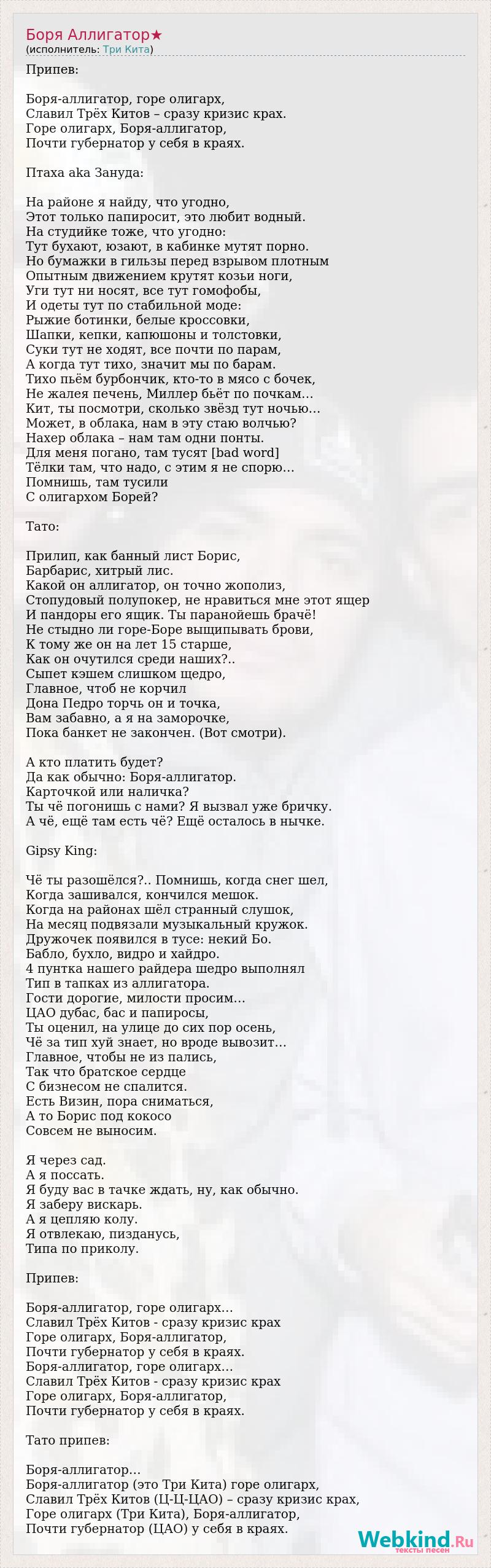 Припев: Боря-аллигатор, горе олигарх, Славил Трёх Китов – сразу кризис крах. Горе олигарх, Боря-аллигатор, Почти губернатор у себя в краях. Птаха аkа Зануда: На районе я найду, что угодно, Этот только папиросит, это любит водный. На студийке тоже, что угодно: Тут бухают, юзают, в кабинке мутят порно. Но бумажки в гильзы перед взрывом плотным Опытным движением крутят козьи ноги, Уги тут ни носят, все тут гомофобы, И одеты тут по стабильной моде: Рыжие ботинки, белые кроссовки, Шапки, кепки, капюшоны и толстовки, Суки тут не ходят, все почти по парам, А когда тут тихо, значит мы по барам. Тихо пьём бурбончик, кто-то в мясо с бочек, Не жалея печень, Миллер бьёт по почкам… Кит, ты посмотри, сколько звёзд тут ночью… Может, в облака, нам в эту стаю волчью? Нахер облака – нам там одни понты. Для меня погано, там тусят [bad word] Тёлки там, что надо, с этим я не спорю… Помнишь, там тусили С олигархом Борей? Тато: Прилип, как банный лист Борис, Барбарис, хитрый лис. Какой он аллигатор, он точно жополиз, Стопудовый полупокер, не нравиться мне этот ящер И пандоры его ящик. Ты паранойешь брачё! Не стыдно ли горе-Боре выщипывать брови, К тому же он на лет 15 старше, Как он очутился среди наших?.. Сыпет кэшем слишком щедро, Главное, чтоб не корчил Дона Педро торчь он и точка, Вам забавно, а я на заморочке, Пока банкет не закончен. (Вот смотри). А кто платить будет? Да как обычно: Боря-аллигатор. Карточкой или наличка? Ты чё погонишь с нами? Я вызвал уже бричку. А чё, ещё там есть чё? Ещё осталось в нычке. Gipsy King: Чё ты разошёлся?.. Помнишь, когда снег шел, Когда зашивался, кончился мешок. Когда на районах шёл странный слушок, На месяц подвязали музыкальный кружок. Дружочек появился в тусе: некий Бо. Бабло, бухло, видро и хайдро. 4 пунтка нашего райдера шедро выполнял Тип в тапках из аллигатора. Гости дорогие, милости просим… ЦАО дубас, бас и папиросы, Ты оценил, на улице до сих пор осень, Чё за тип хуй знает, но вроде вывозит… Главное, чтобы не из пались, Так что братское сердце С бизнесом не спалится. Есть Визин, пора сниматься, А то Борис под кокосо Совсем не выносим. Я через сад. А я поссать. Я буду вас в тачке ждать, ну, как обычно. Я заберу вискарь. А я цепляю колу. Я отвлекаю, пизданусь, Типа по приколу. Припев: Боря-аллигатор, горе олигарх… Славил Трёх Китов - сразу кризис крах Горе олигарх, Боря-аллигатор, Почти губернатор у себя в краях. Боря-аллигатор, горе олигарх… Славил Трёх Китов - сразу кризис крах Горе олигарх, Боря-аллигатор, Почти губернатор у себя в краях. Тато припев: Боря-аллигатор… Боря-аллигатор (это Три Кита) горе олигарх, Славил Трёх Китов (Ц-Ц-ЦАО) – сразу кризис крах, Горе олигарх (Три Кита), Боря-аллигатор, Почти губернатор (ЦАО) у себя в краях.