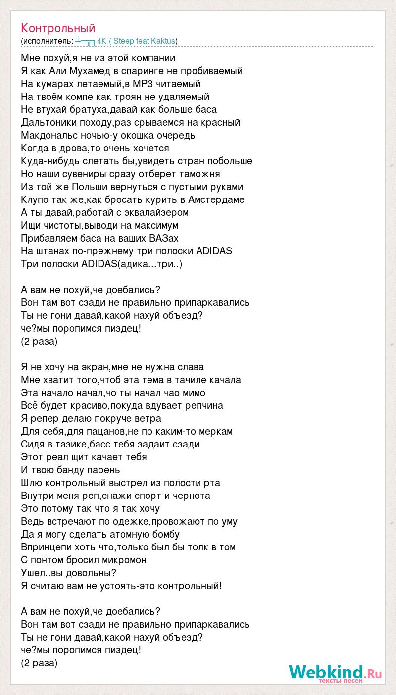 Мне похуй,я не из этой компании Я как Али Мухамед в спаринге не пробиваемый На кумарах летаемый,в MP3 читаемый На твоём компе как троян не удаляемый Не втухай братуха,давай как больше баса Дальтоники походу,раз срываемся на красный Макдональс ночью-у окошка очередь Когда в дрова,то очень хочется Куда-нибудь слетать бы,увидеть стран побольше Но наши сувениры сразу отберет таможня Из той же Польши вернуться с пустыми руками Клупо так же,как бросать курить в Амстердаме А ты давай,работай с эквалайзером Ищи чистоты,выводи на максимум Прибавляем баса на ваших ВАЗах На штанах по-прежнему три полоски ADIDAS Три полоски ADIDAS(адика...три..) А вам не похуй,че доебались? Вон там вот сзади не правильно припаркавались Ты не гони давай,какой нахуй объезд? че?мы поропимся пиздец! (2 раза) Я не хочу на экран,мне не нужна слава Мне хватит того,чтоб эта тема в тачиле качала Эта начало начал,чо ты начал чао мимо Всё будет красиво,покуда вдувает репчина Я репер делаю покруче ветра Для себя,для пацанов,не по каким-то меркам Сидя в тазике,басс тебя задаит сзади Этот реал щит качает тебя И твою банду парень Шлю контрольный выстрел из полости рта Внутри меня реп,снажи спорт и чернота Это потому так что я так хочу Ведь встречают по одежке,провожают по уму Да я могу сделать атомную бомбу Впринцепи хоть что,только был бы толк в том С понтом бросил микромон Ушел..вы довольны? Я считаю вам не устоять-это контрольный! А вам не похуй,че доебались? Вон там вот сзади не правильно припаркавались Ты не гони давай,какой нахуй объезд? че?мы поропимся пиздец! (2 раза)