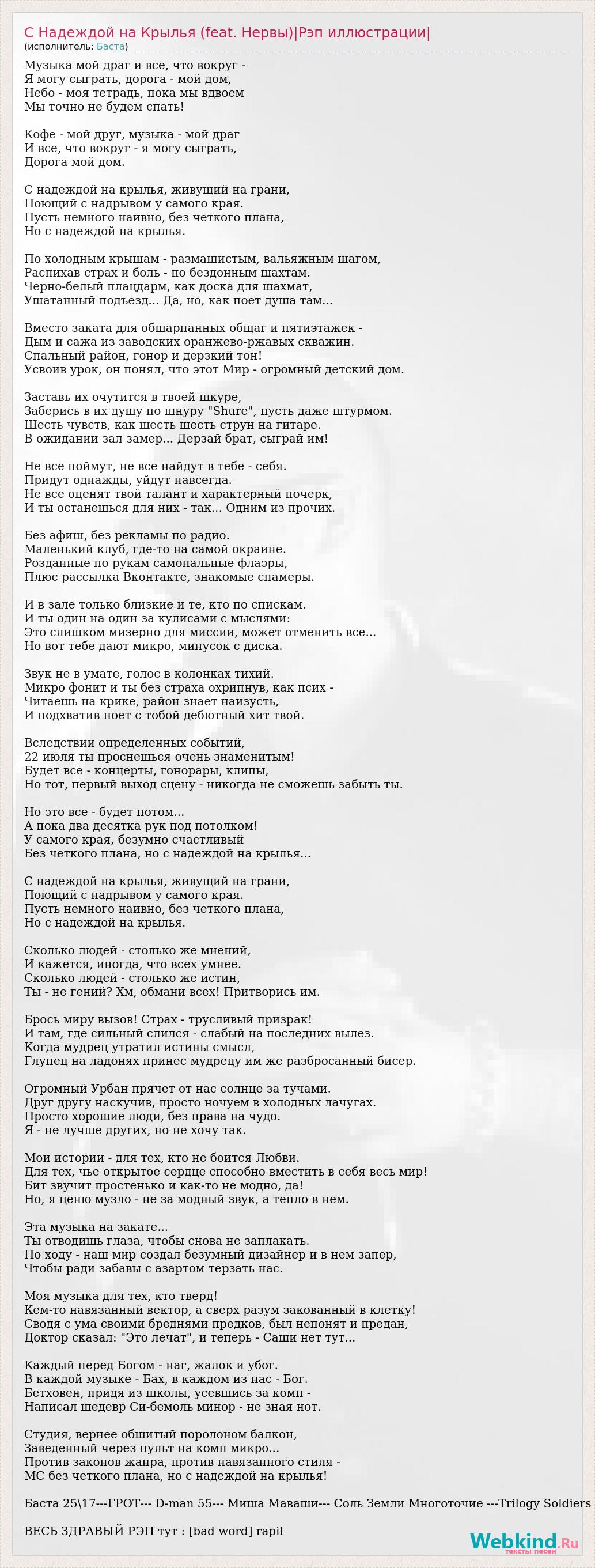 Музыка мой драг и все, что вокруг - Я могу сыграть, дорога - мой дом, Небо - моя тетрадь, пока мы вдвоем Мы точно не будем спать! Кофе - мой друг, музыка - мой драг И все, что вокруг - я могу сыграть, Дорога мой дом. С надеждой на крылья, живущий на грани, Поющий с надрывом у самого края. Пусть немного наивно, без четкого плана, Но с надеждой на крылья. По холодным крышам - размашистым, вальяжным шагом, Распихав страх и боль - по бездонным шахтам. Черно-белый плацдарм, как доска для шахмат, Ушатанный подъезд... Да, но, как поет душа там... Вместо заката для обшарпанных общаг и пятиэтажек - Дым и сажа из заводских оранжево-ржавых скважин. Спальный район, гонор и дерзкий тон! Усвоив урок, он понял, что этот Мир - огромный детский дом. Заставь их очутится в твоей шкуре, Заберись в их душу по шнуру "Shure", пусть даже штурмом. Шесть чувств, как шесть шесть струн на гитаре. В ожидании зал замер... Дерзай брат, сыграй им! Не все поймут, не все найдут в тебе - себя. Придут однажды, уйдут навсегда. Не все оценят твой талант и характерный почерк, И ты останешься для них - так... Одним из прочих. Без афиш, без рекламы по радио. Маленький клуб, где-то на самой окраине. Розданные по рукам самопальные флаэры, Плюс рассылка Вконтакте, знакомые спамеры. И в зале только близкие и те, кто по спискам. И ты один на один за кулисами с мыслями: Это слишком мизерно для миссии, может отменить все... Но вот тебе дают микро, минусок с диска. Звук не в умате, голос в колонках тихий. Микро фонит и ты без страха охрипнув, как псих - Читаешь на крике, район знает наизусть, И подхватив поет с тобой дебютный хит твой. Вследствии определенных событий, 22 июля ты проснешься очень знаменитым! Будет все - концерты, гонорары, клипы, Но тот, первый выход сцену - никогда не сможешь забыть ты. Но это все - будет потом... А пока два десятка рук под потолком! У самого края, безумно счастливый Без четкого плана, но с надеждой на крылья... С надеждой на крылья, живущий на грани, Поющий с надрывом у самого края. Пусть немного наивно, без четкого плана, Но с надеждой на крылья. Сколько людей - столько же мнений, И кажется, иногда, что всех умнее. Сколько людей - столько же истин, Ты - не гений? Хм, обмани всех! Притворись им. Брось миру вызов! Страх - трусливый призрак! И там, где сильный слился - слабый на последних вылез. Когда мудрец утратил истины смысл, Глупец на ладонях принес мудрецу им же разбросанный бисер. Огромный Урбан прячет от нас солнце за тучами. Друг другу наскучив, просто ночуем в холодных лачугах. Просто хорошие люди, без права на чудо. Я - не лучше других, но не хочу так. Мои истории - для тех, кто не боится Любви. Для тех, чье открытое сердце способно вместить в себя весь мир! Бит звучит простенько и как-то не модно, да! Но, я ценю музло - не за модный звук, а тепло в нем. Эта музыка на закате... Ты отводишь глаза, чтобы снова не заплакать. По ходу - наш мир создал безумный дизайнер и в нем запер, Чтобы ради забавы с азартом терзать нас. Моя музыка для тех, кто тверд! Кем-то навязанный вектор, а сверх разум закованный в клетку! Сводя с ума своими бреднями предков, был непонят и предан, Доктор сказал: "Это лечат", и теперь - Саши нет тут... Каждый перед Богом - наг, жалок и убог. В каждой музыке - Бах, в каждом из нас - Бог. Бетховен, придя из школы, усевшись за комп - Написал шедевр Си-бемоль минор - не зная нот. Студия, вернее обшитый поролоном балкон, Заведен