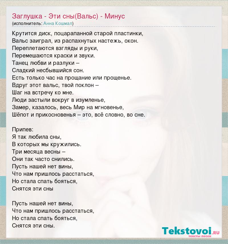 Крутится диск, поцарапанной старой пластинки, Вальс заиграл, из распахнутых настежь, окон. Переплетаются взгляды и руки, Перемешаются краски и звуки. Танец любви и разлуки – Сладкий несбывшийся сон. Есть только час на прощание или прощенье. Вдруг этот вальс, твой поклон – Шаг на встречу ко мне. Люди застыли вокруг в изумленье, Замер, казалось, весь Мир на мгновенье, Шёпот и прикосновенья – это, всё словно, во сне. Припев: Я так любила сны, В которых мы кружились. Три месяца весны – Они так часто снились. Пусть нашей нет вины, Что нам пришлось расстаться, Но стала спать бояться, Снятся эти сны Пусть нашей нет вины, Что нам пришлось расстаться, Но стала спать бояться, Снятся эти сны.