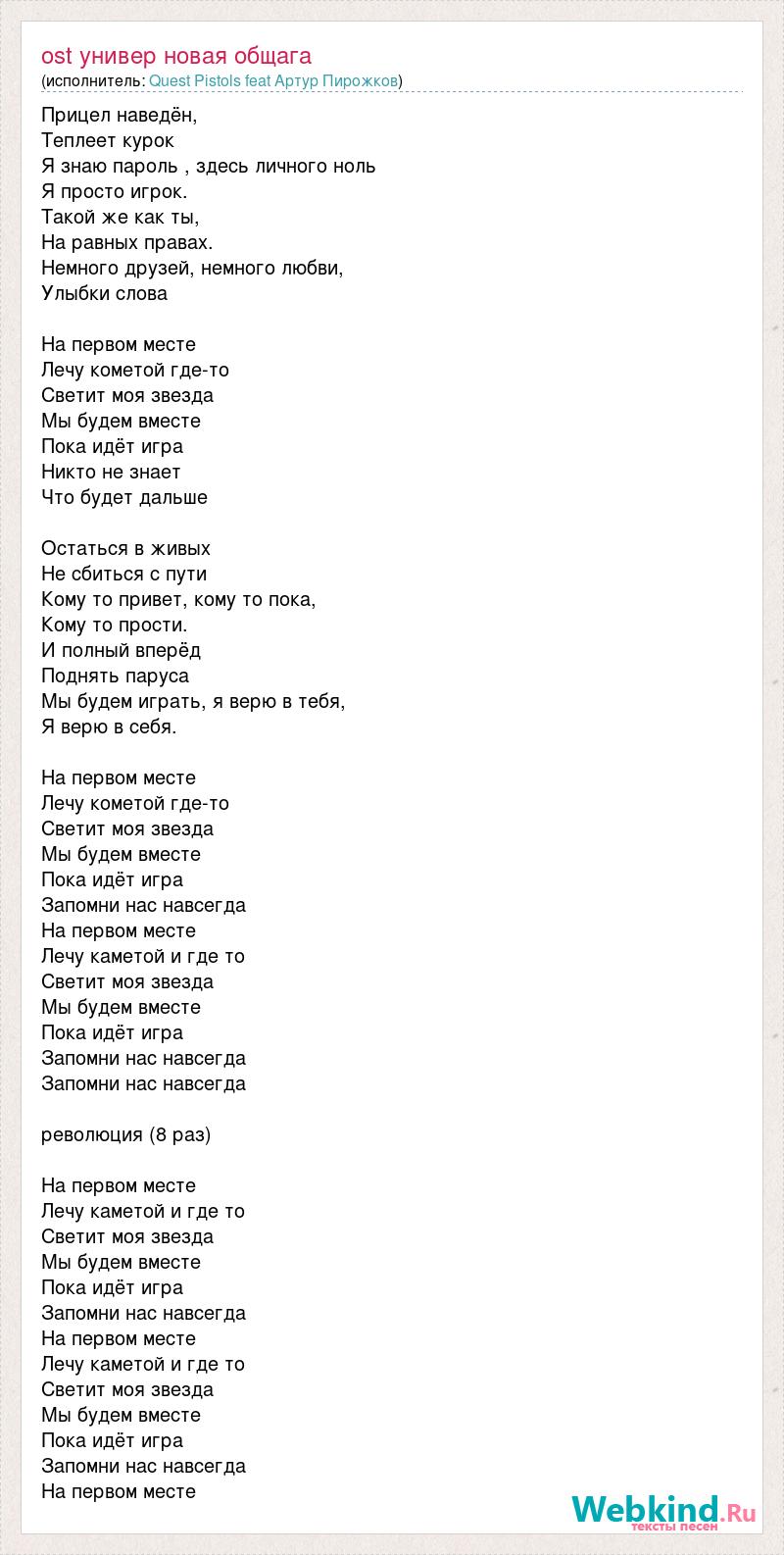 Прицел наведён, Теплеет курок Я знаю пароль , здесь личного ноль Я просто игрок. Такой же как ты, На равных правах. Немного друзей, немного любви, Улыбки слова На первом месте Лечу кометой где-то Светит моя звезда Мы будем вместе Пока идёт игра Никто не знает Что будет дальше Остаться в живых Не сбиться с пути Кому то привет, кому то пока, Кому то прости. И полный вперёд Поднять паруса Мы будем играть, я верю в тебя, Я верю в себя. На первом месте Лечу кометой где-то Светит моя звезда Мы будем вместе Пока идёт игра Запомни нас навсегда На первом месте Лечу каметой и где то Светит моя звезда Мы будем вместе Пока идёт игра Запомни нас навсегда Запомни нас навсегда революция (8 раз) На первом месте Лечу каметой и где то Светит моя звезда Мы будем вместе Пока идёт игра Запомни нас навсегда На первом месте Лечу каметой и где то Светит моя звезда Мы будем вместе Пока идёт игра Запомни нас навсегда На первом месте