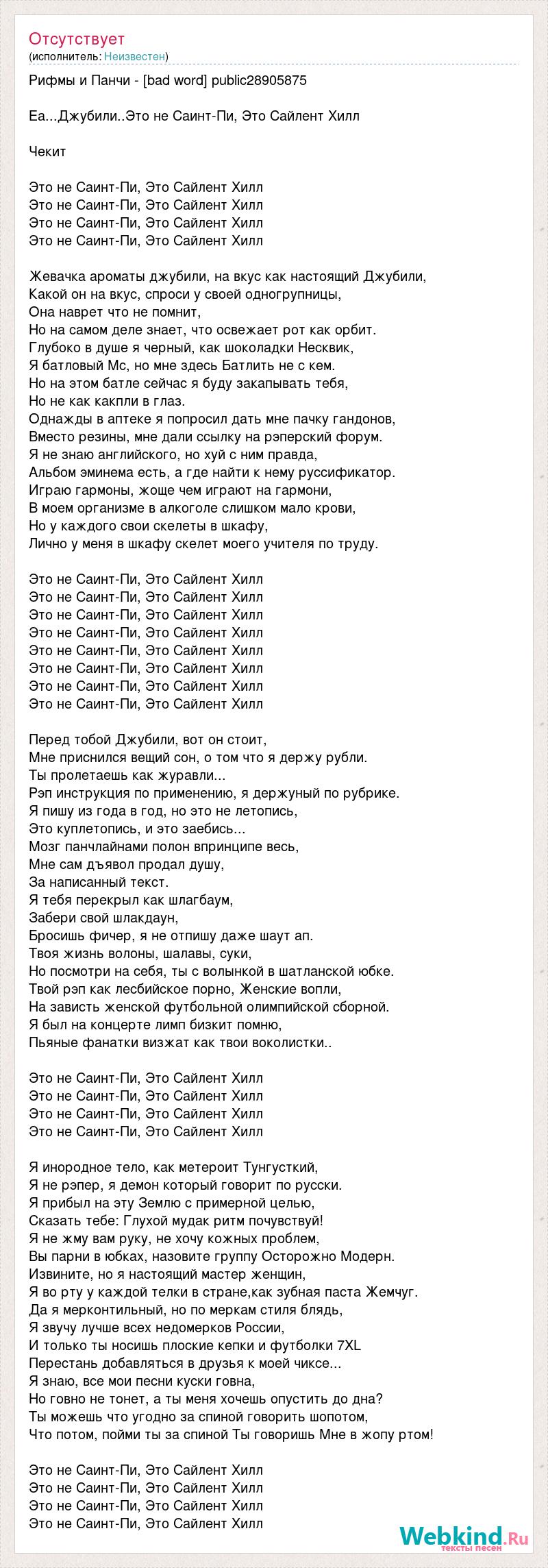 Рифмы и Панчи - [bad word] public28905875 Еа...Джубили..Это не Саинт-Пи, Это Сайлент Хилл Чекит Это не Саинт-Пи, Это Сайлент Хилл Это не Саинт-Пи, Это Сайлент Хилл Это не Саинт-Пи, Это Сайлент Хилл Это не Саинт-Пи, Это Сайлент Хилл Жевачка ароматы джубили, на вкус как настоящий Джубили, Какой он на вкус, спроси у своей одногрупницы, Она наврет что не помнит, Но на самом деле знает, что освежает рот как орбит. Глубоко в душе я черный, как шоколадки Несквик, Я батловый Мс, но мне здесь Батлить не с кем. Но на этом батле сейчас я буду закапывать тебя, Но не как какпли в глаз. Однажды в аптеке я попросил дать мне пачку гандонов, Вместо резины, мне дали ссылку на рэперский форум. Я не знаю английского, но хуй с ним правда, Альбом эминема есть, а где найти к нему руссификатор. Играю гармоны, жоще чем играют на гармони, В моем организме в алкоголе слишком мало крови, Но у каждого свои скелеты в шкафу, Лично у меня в шкафу скелет моего учителя по труду. Это не Саинт-Пи, Это Сайлент Хилл Это не Саинт-Пи, Это Сайлент Хилл Это не Саинт-Пи, Это Сайлент Хилл Это не Саинт-Пи, Это Сайлент Хилл Это не Саинт-Пи, Это Сайлент Хилл Это не Саинт-Пи, Это Сайлент Хилл Это не Саинт-Пи, Это Сайлент Хилл Это не Саинт-Пи, Это Сайлент Хилл Перед тобой Джубили, вот он стоит, Мне приснился вещий сон, о том что я держу рубли. Ты пролетаешь как журавли... Рэп инструкция по применению, я держуный по рубрике. Я пишу из года в год, но это не летопись, Это куплетопись, и это заебись... Мозг панчлайнами полон впринципе весь, Мне сам дъявол продал душу, За написанный текст. Я тебя перекрыл как шлагбаум, Забери свой шлакдаун, Бросишь фичер, я не отпишу даже шаут ап. Твоя жизнь волоны, шалавы, суки, Но посмотри на себя, ты с волынкой в шатланской юбке. Твой рэп как лесбийское порно, Женские вопли, На зависть женской футбольной олимпийской сборной. Я был на концерте лимп бизкит помню, Пьяные фанатки визжат как твои воколистки.. Это не Саинт-Пи, Это Сайлент Хилл Это не Саинт-Пи, Это Сайлент Хилл Это не Саинт-Пи, Это Сайлент Хилл Это не Саинт-Пи, Это Сайлент Хилл Я инородное тело, как метероит Тунгусткий, Я не рэпер, я демон который говорит по русски. Я прибыл на эту Землю с примерной целью, Сказать тебе: Глухой мудак ритм почувствуй! Я не жму вам руку, не хочу кожных проблем, Вы парни в юбках, назовите группу Осторожно Модерн. Извините, но я настоящий мастер женщин, Я во рту у каждой телки в стране,как зубная паста Жемчуг. Да я мерконтильный, но по меркам стиля блядь, Я звучу лучше всех недомерков России, И только ты носишь плоские кепки и футболки 7XL Перестань добавляться в друзья к моей чиксе... Я знаю, все мои песни куски говна, Но говно не тонет, а ты меня хочешь опустить до дна? Ты можешь что угодно за спиной говорить шопотом, Что потом, пойми ты за спиной Ты говоришь Мне в жопу ртом! Это не Саинт-Пи, Это Сайлент Хилл Это не Саинт-Пи, Это Сайлент Хилл Это не Саинт-Пи, Это Сайлент Хилл Это не Саинт-Пи, Это Сайлент Хилл