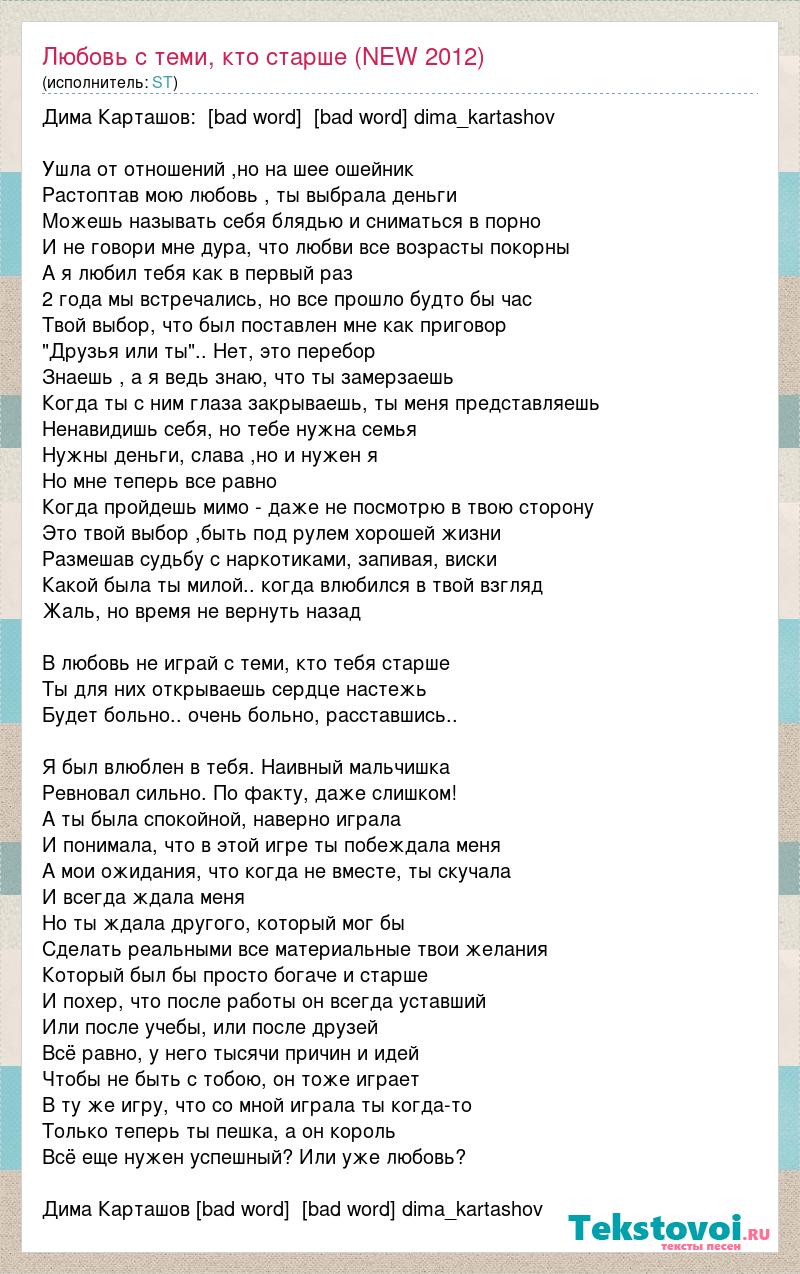 Дима Карташов: [bad word] [bad word] dima_kartashov Ушла от отношений ,но на шее ошейник Растоптав мою любовь , ты выбрала деньги Можешь называть себя блядью и сниматься в порно И не говори мне дура, что любви все возрасты покорны А я любил тебя как в первый раз 2 года мы встречались, но все прошло будто бы час Твой выбор, что был поставлен мне как приговор "Друзья или ты".. Нет, это перебор Знаешь , а я ведь знаю, что ты замерзаешь Когда ты с ним глаза закрываешь, ты меня представляешь Ненавидишь себя, но тебе нужна семья Нужны деньги, слава ,но и нужен я Но мне теперь все равно Когда пройдешь мимо - даже не посмотрю в твою сторону Это твой выбор ,быть под рулем хорошей жизни Размешав судьбу с наркотиками, запивая, виски Какой была ты милой.. когда влюбился в твой взгляд Жаль, но время не вернуть назад В любовь не играй с теми, кто тебя старше Ты для них открываешь сердце настежь Будет больно.. очень больно, расставшись.. Я был влюблен в тебя. Наивный мальчишка Ревновал сильно. По факту, даже слишком! А ты была спокойной, наверно играла И понимала, что в этой игре ты побеждала меня А мои ожидания, что когда не вместе, ты скучала И всегда ждала меня Но ты ждала другого, который мог бы Сделать реальными все материальные твои желания Который был бы просто богаче и старше И похер, что после работы он всегда уставший Или после учебы, или после друзей Всё равно, у него тысячи причин и идей Чтобы не быть с тобою, он тоже играет В ту же игру, что со мной играла ты когда-то Только теперь ты пешка, а он король Всё еще нужен успешный? Или уже любовь? Дима Карташов [bad word] [bad word] dima_kartashov