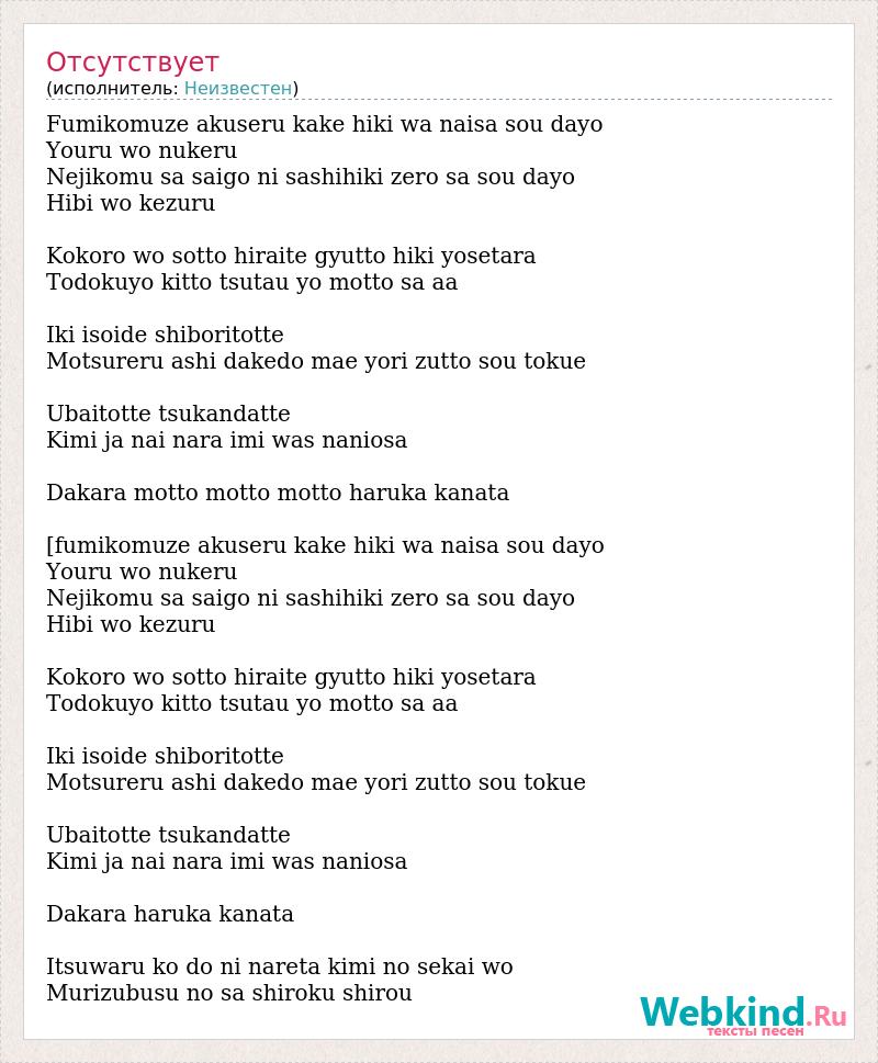 Fumikomuze akuseru kake hiki wa naisa sou dayo Youru wo nukeru Nejikomu sa saigo ni sashihiki zero sa sou dayo Hibi wo kezuru Kokoro wo sotto hiraite gyutto hiki yosetara Todokuyo kitto tsutau yo motto sa aa Iki isoide shiboritotte Motsureru ashi dakedo mae yori zutto sou tokue Ubaitotte tsukandatte Kimi ja nai nara imi was naniosa Dakara motto motto motto haruka kanata [fumikomuze akuseru kake hiki wa naisa sou dayo Youru wo nukeru Nejikomu sa saigo ni sashihiki zero sa sou dayo Hibi wo kezuru Kokoro wo sotto hiraite gyutto hiki yosetara Todokuyo kitto tsutau yo motto sa aa Iki isoide shiboritotte Motsureru ashi dakedo mae yori zutto sou tokue Ubaitotte tsukandatte Kimi ja nai nara imi was naniosa Dakara haruka kanata Itsuwaru ko do ni nareta kimi no sekai wo Murizubusu no sa shiroku shirou