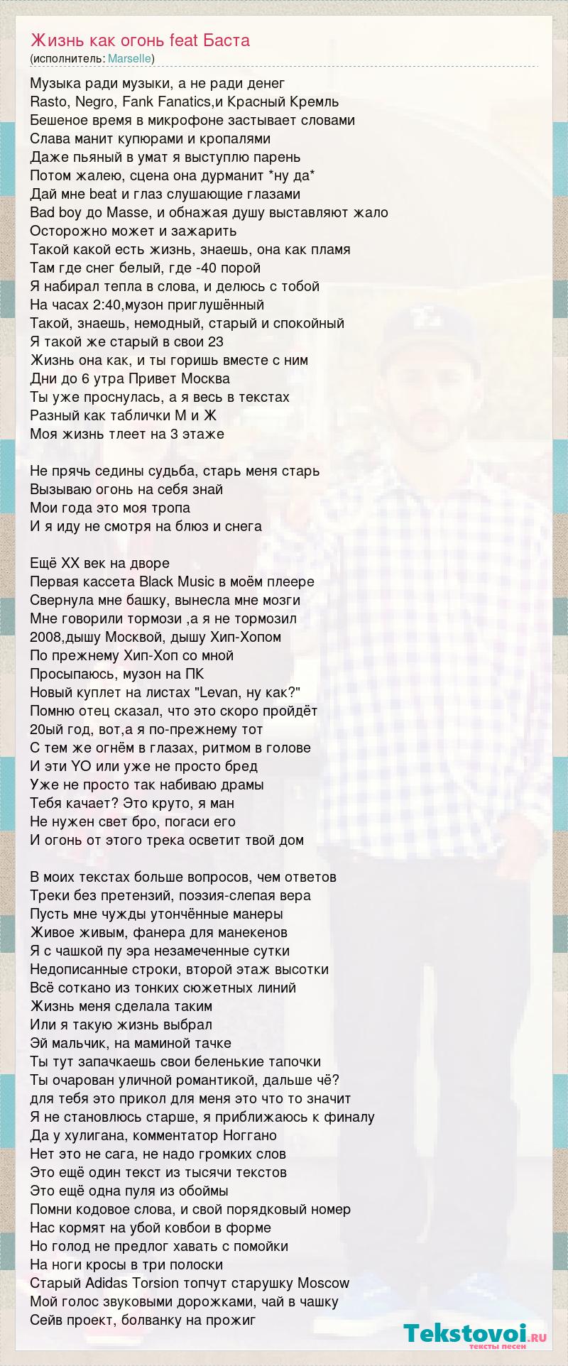 Музыка ради музыки, а не ради денег Rasto, Negro, Fank Fanatics,и Красный Кремль Бешеное время в микрофоне застывает словами Слава манит купюрами и кропалями Даже пьяный в умат я выступлю парень Потом жалею, сцена она дурманит *ну да* Дай мне beat и глаз слушающие глазами Bad boy до Masse, и обнажая душу выставляют жало Осторожно может и зажарить Такой какой есть жизнь, знаешь, она как пламя Там где снег белый, где -40 порой Я набирал тепла в слова, и делюсь с тобой На часах 2:40,музон приглушённый Такой, знаешь, немодный, старый и спокойный Я такой же старый в свои 23 Жизнь она как, и ты горишь вместе с ним Дни до 6 утра Привет Москва Ты уже проснулась, а я весь в текстах Разный как таблички М и Ж Моя жизнь тлеет на 3 этаже Не прячь седины судьба, старь меня старь Вызываю огонь на себя знай Мои года это моя тропа И я иду не смотря на блюз и снега Ещё XX век на дворе Первая кассета Black Music в моём плеере Свернула мне башку, вынесла мне мозги Мне говорили тормози ,а я не тормозил 2008,дышу Москвой, дышу Хип-Хопом По прежнему Хип-Хоп со мной Просыпаюсь, музон на ПК Новый куплет на листах "Levan, ну как?" Помню отец сказал, что это скоро пройдёт 20ый год, вот,а я по-прежнему тот С тем же огнём в глазах, ритмом в голове И эти YO или уже не просто бред Уже не просто так набиваю драмы Тебя качает? Это круто, я ман Не нужен свет бро, погаси его И огонь от этого трека осветит твой дом В моих текстах больше вопросов, чем ответов Треки без претензий, поэзия-слепая вера Пусть мне чужды утончённые манеры Живое живым, фанера для манекенов Я с чашкой пу эра незамеченные сутки Недописанные строки, второй этаж высотки Всё соткано из тонких сюжетных линий Жизнь меня сделала таким Или я такую жизнь выбрал Эй мальчик, на маминой тачке Ты тут запачкаешь свои беленькие тапочки Ты очарован уличной романтикой, дальше чё? для тебя это прикол для меня это что то значит Я не становлюсь старше, я приближаюсь к финалу Да у хулигана, комментатор Ноггано Нет это не сага, не надо громких слов Это ещё один текст из тысячи текстов Это ещё одна пуля из обоймы Помни кодовое слова, и свой порядковый номер Нас кормят на убой ковбои в форме Но голод не предлог хавать с помойки На ноги кросы в три полоски Старый Adidas Torsion топчут старушку Moscow Мой голос звуковыми дорожками, чай в чашку Сейв проект, болванку на прожиг