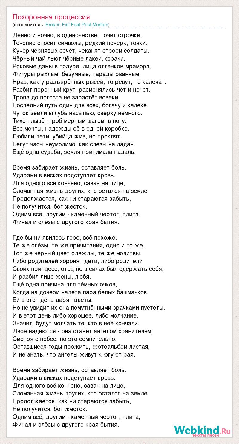 Денно и ночно, в одиночестве, точит строчки. Течение сносит символы, редкий почерк, точки. Кучер чернявых сечёт, чеканят строем солдаты. Чёрный чай льют чёрные лакеи, фраки. Роковые дамы в трауре, лица оттенком мрамора, Фигуры рыхлые, безумные, парады рванные. Нрав, как у разъярённых рысей, то ревут, то калечат. Разбит порочный круг, разменялись чёт и нечет. Тропа до погоста не зарастёт вовеки. Последний путь один для всех, богачу и калеке. Чуток земли вглубь насыпью, сверху немного. Тихо плывёт гроб мерным шагом, в ногу. Все мечты, надежды её в одной коробке. Любили дети, убийца жив, но проклят. Бегут часы неумолимо, как слёзы на ладан. Ещё одна судьба, земля принимала падаль. Время забирает жизнь, оставляет боль. Ударами в висках подступает кровь. Для одного всё кончено, саван на лице, Сломанная жизнь других, кто остался на земле Продолжается, как ни стараются забыть, Не получится, бог жесток. Одним всё, другим - каменный чертог, плита, Финал и слёзы с другого края бытия. Где бы ни явилось горе, всё похоже. Те же слёзы, те же причитания, одно и то же. Тот же чёрный цвет одежды, те же молитвы. Либо родителей хоронят дети, либо родители Своих принцесс, отец не в силах был сдержать себя, И разбил лицо жены, любя. Ещё одна причина для тёмных очков, Когда на дочери надета пара белых башмачков. Ей в этот день дарят цветы, Но не увидит их она помутнёнными зрачками пустоты. И в этот день либо хорошее, либо молчание, Значит, будут молчать те, кто в неё кончали. Двое надеются - она станет ангелом хранителем, Смотря с небес, но это сомнительно. Оставшиеся годы прожить, фотоальбом листая, И не знать, что ангелы живут к югу от рая. Время забирает жизнь, оставляет боль. Ударами в висках подступает кровь. Для одного всё кончено, саван на лице, Сломанная жизнь других, кто остался на земле Продолжается, как ни стараются забыть, Не получится, бог жесток. Одним всё, другим - каменный чертог, плита, Финал и слёзы с другого края бытия.