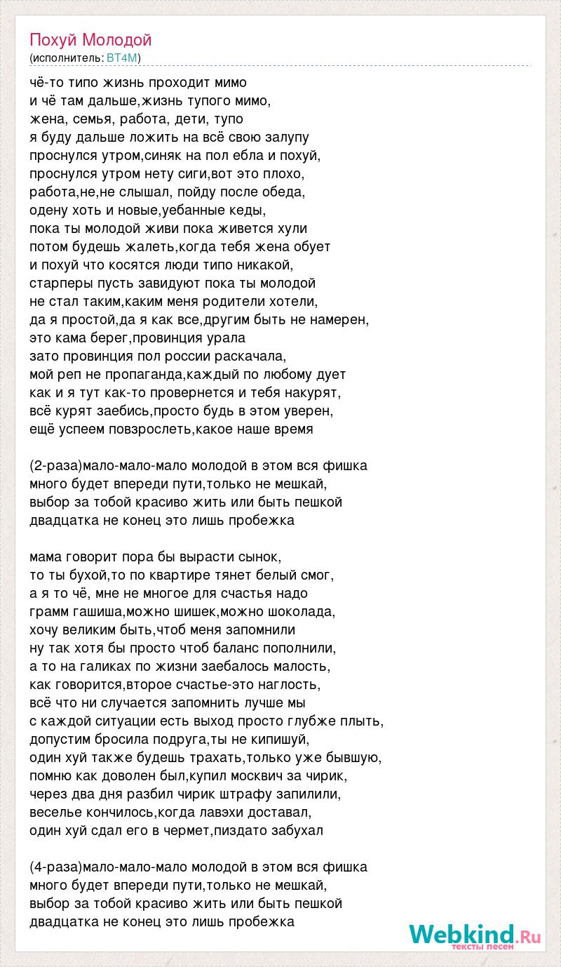 чё-то типо жизнь проходит мимо и чё там дальше,жизнь тупого мимо, жена, семья, работа, дети, тупо я буду дальше ложить на всё свою залупу проснулся утром,синяк на пол ебла и похуй, проснулся утром нету сиги,вот это плохо, работа,не,не слышал, пойду после обеда, одену хоть и новые,уебанные кеды, пока ты молодой живи пока живется хули потом будешь жалеть,когда тебя жена обует и похуй что косятся люди типо никакой, старперы пусть завидуют пока ты молодой не стал таким,каким меня родители хотели, да я простой,да я как все,другим быть не намерен, это кама берег,провинция урала зато провинция пол россии раскачала, мой реп не пропаганда,каждый по любому дует как и я тут как-то провернется и тебя накурят, всё курят заебись,просто будь в этом уверен, ещё успеем повзрослеть,какое наше время (2-раза)мало-мало-мало молодой в этом вся фишка много будет впереди пути,только не мешкай, выбор за тобой красиво жить или быть пешкой двадцатка не конец это лишь пробежка мама говорит пора бы вырасти сынок, то ты бухой,то по квартире тянет белый смог, а я то чё, мне не многое для счастья надо грамм гашиша,можно шишек,можно шоколада, хочу великим быть,чтоб меня запомнили ну так хотя бы просто чтоб баланс пополнили, а то на галиках по жизни заебалось малость, как говорится,второе счастье-это наглость, всё что ни случается запомнить лучше мы с каждой ситуации есть выход просто глубже плыть, допустим бросила подруга,ты не кипишуй, один хуй также будешь трахать,только уже бывшую, помню как доволен был,купил москвич за чирик, через два дня разбил чирик штрафу запилили, веселье кончилось,когда лавэхи доставал, один хуй сдал его в чермет,пиздато забухал (4-раза)мало-мало-мало молодой в этом вся фишка много будет впереди пути,только не мешкай, выбор за тобой красиво жить или быть пешкой двадцатка не конец это лишь пробежка
