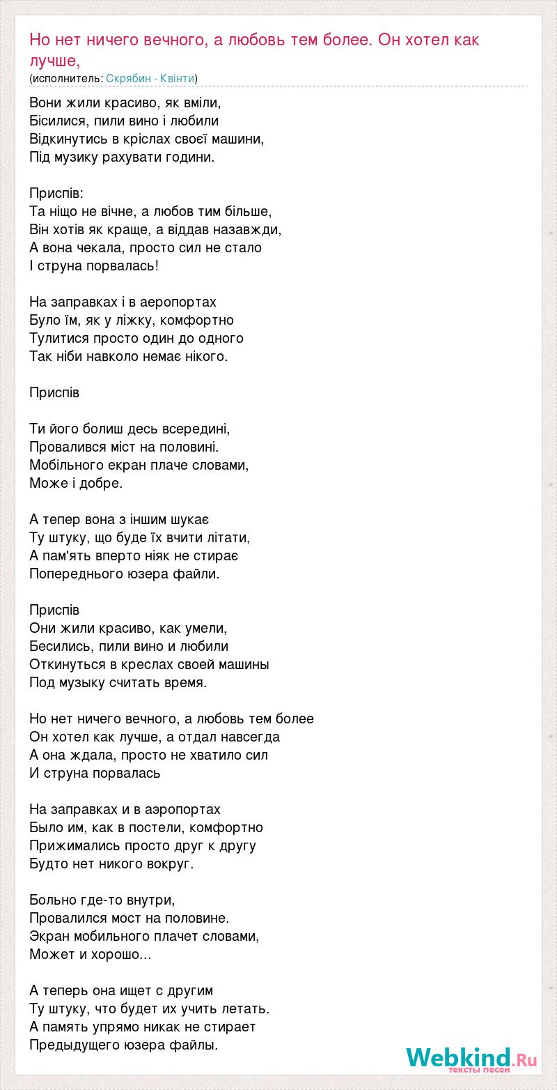 Вони жили красиво, як вміли, Бісилися, пили вино і любили Відкинутись в кріслах своєї машини, Під музику рахувати години. Приспів: Та ніщо не вічне, а любов тим більше, Він хотів як краще, а віддав назавжди, А вона чекала, просто сил не стало І струна порвалась! На заправках і в аеропортах Було їм, як у ліжку, комфортно Тулитися просто один до одного Так ніби навколо немає нікого. Приспів Ти його болиш десь всередині, Провалився міст на половині. Мобільного екран плаче словами, Може і добре. А тепер вона з іншим шукає Ту штуку, що буде їх вчити літати, А пам'ять вперто ніяк не стирає Попереднього юзера файли. Приспів Они жили красиво, как умели, Бесились, пили вино и любили Откинуться в креслах своей машины Под музыку считать время. Но нет ничего вечного, а любовь тем более Он хотел как лучше, а отдал навсегда А она ждала, просто не хватило сил И струна порвалась На заправках и в аэропортах Было им, как в постели, комфортно Прижимались просто друг к другу Будто нет никого вокруг. Больно где-то внутри, Провалился мост на половине. Экран мобильного плачет словами, Может и хорошо... А теперь она ищет с другим Ту штуку, что будет их учить летать. А память упрямо никак не стирает Предыдущего юзера файлы.