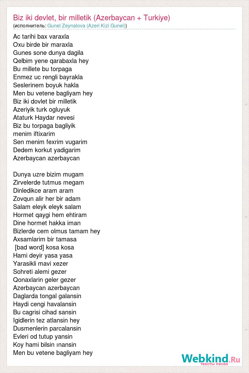 Ac tarihi bax varaxla Oxu birde bir maraxla Gunes sone dunya dagila Qelbim yene qarabaxla hey Bu millete bu torpaga Enmez uc rengli bayrakla Seslerinem boyuk hakla Men bu vetene bagliyam hey Biz iki dovlet bir milletik Azeriyik turk ogluyuk Ataturk Haydar nevesi Biz bu torpaga bagliyik menim iftixarim Sen menim fexrim vugarim Dedem korkut yadigarim Azerbaycan azerbaycan Dunya uzre bizim mugam Zirvelerde tutmus megam Dinledikce aram aram Zovqun alir her bir adam Salam eleyk eleyk salam Hormet qaygi hem ehtiram Dine hormet hakka iman Bizlerde cem olmus tamam hey Axsamlarim bir tamasa [bad word] kosa kosa Hami deyir yasa yasa Yarasikli mavi xezer Sohreti alemi gezer Qonaxlarin geler gezer Azerbaycan azerbaycan Daglarda tongal galansin Haydi cengi havalansin Bu cagrisi cihad sansin Igidlerin tez atlansin hey Dusmenlerin parcalansin Evleri od tutup yansin Koy hami bilsin ınansin Men bu vetene bagliyam hey