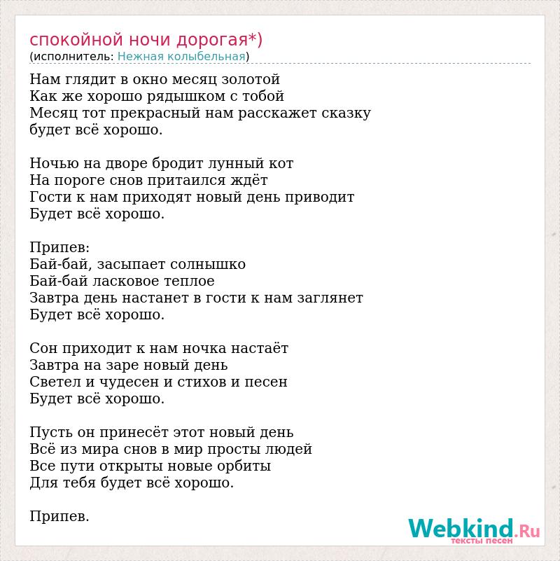 Нам глядит в окно месяц золотой Как же хорошо рядышком с тобой Месяц тот прекрасный нам расскажет сказку будет всё хорошо. Ночью на дворе бродит лунный кот На пороге снов притаился ждёт Гости к нам приходят новый день приводит Будет всё хорошо. Припев: Бай-бай, засыпает солнышко Бай-бай ласковое теплое Завтра день настанет в гости к нам заглянет Будет всё хорошо. Сон приходит к нам ночка настаёт Завтра на заре новый день Светел и чудесен и стихов и песен Будет всё хорошо. Пусть он принесёт этот новый день Всё из мира снов в мир просты людей Все пути открыты новые орбиты Для тебя будет всё хорошо. Припев.