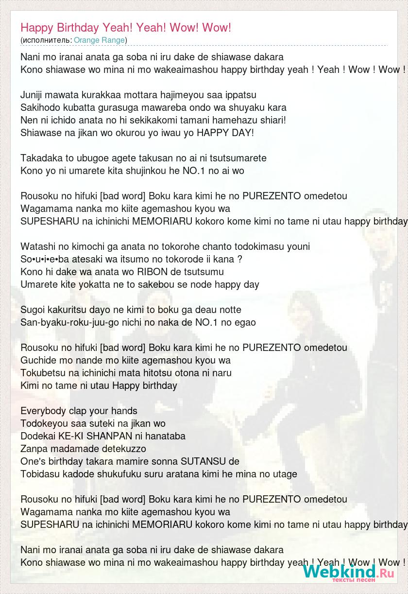 Nani mo iranai anata ga soba ni iru dake de shiawase dakara Kono shiawase wo mina ni mo wakeaimashou happy birthday yeah ! Yeah ! Wow ! Wow ! Juniji mawata kurakkaa mottara hajimeyou saa ippatsu Sakihodo kubatta gurasuga mawareba ondo wa shuyaku kara Nen ni ichido anata no hi sekikakomi tamani hamehazu shiari! Shiawase na jikan wo okurou yo iwau yo HAPPY DAY! Takadaka to ubugoe agete takusan no ai ni tsutsumarete Kono yo ni umarete kita shujinkou he NO.1 no ai wo Rousoku no hifuki [bad word] Boku kara kimi he no PUREZENTO omedetou Wagamama nanka mo kiite agemashou kyou wa SUPESHARU na ichinichi MEMORIARU kokoro kome kimi no tame ni utau happy birthday Watashi no kimochi ga anata no tokorohe chanto todokimasu youni So•u•i•e•ba atesaki wa itsumo no tokorode ii kana ? Kono hi dake wa anata wo RIBON de tsutsumu Umarete kite yokatta ne to sakebou se node happy day Sugoi kakuritsu dayo ne kimi to boku ga deau notte San-byaku-roku-juu-go nichi no naka de NO.1 no egao Rousoku no hifuki [bad word] Boku kara kimi he no PUREZENTO omedetou Guchide mo nande mo kiite agemashou kyou wa Tokubetsu na ichinichi mata hitotsu otona ni naru Kimi no tame ni utau Happy birthday Everybody clap your hands Todokeyou saa suteki na jikan wo Dodekai KE-KI SHANPAN ni hanataba Zanpa madamade detekuzzo One's birthday takara mamire sonna SUTANSU de Tobidasu kadode shukufuku suru aratana kimi he mina no utage Rousoku no hifuki [bad word] Boku kara kimi he no PUREZENTO omedetou Wagamama nanka mo kiite agemashou kyou wa SUPESHARU na ichinichi MEMORIARU kokoro kome kimi no tame ni utau happy birthday Nani mo iranai anata ga soba ni iru dake de shiawase dakara Kono shiawase wo mina ni mo wakeaimashou happy birthday yeah ! Yeah ! Wow ! Wow !