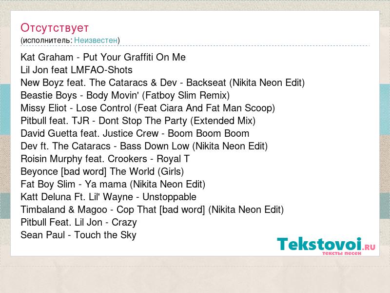 Kat Graham - Put Your Graffiti On Me Lil Jon feat LMFAO-Shots New Boyz feat. The Cataracs & Dev - Backseat (Nikita Neon Edit) Beastie Boys - Body Movin' (Fatboy Slim Remix) Missy Eliot - Lose Control (Feat Ciara And Fat Man Scoop) Pitbull feat. TJR - Dont Stop The Party (Extended Mix) David Guetta feat. Justice Crew - Boom Boom Boom Dev ft. The Cataracs - Bass Down Low (Nikita Neon Edit) Roisin Murphy feat. Crookers - Royal T Beyonce - Run The World (Girls) Fat Boy Slim - Ya mama (Nikita Neon Edit) Katt Deluna Ft. Lil' Wayne - Unstoppable Timbaland & Magoo - Cop That Shit (Nikita Neon Edit) Pitbull Feat. Lil Jon - Crazy Sean Paul - Touch the Sky