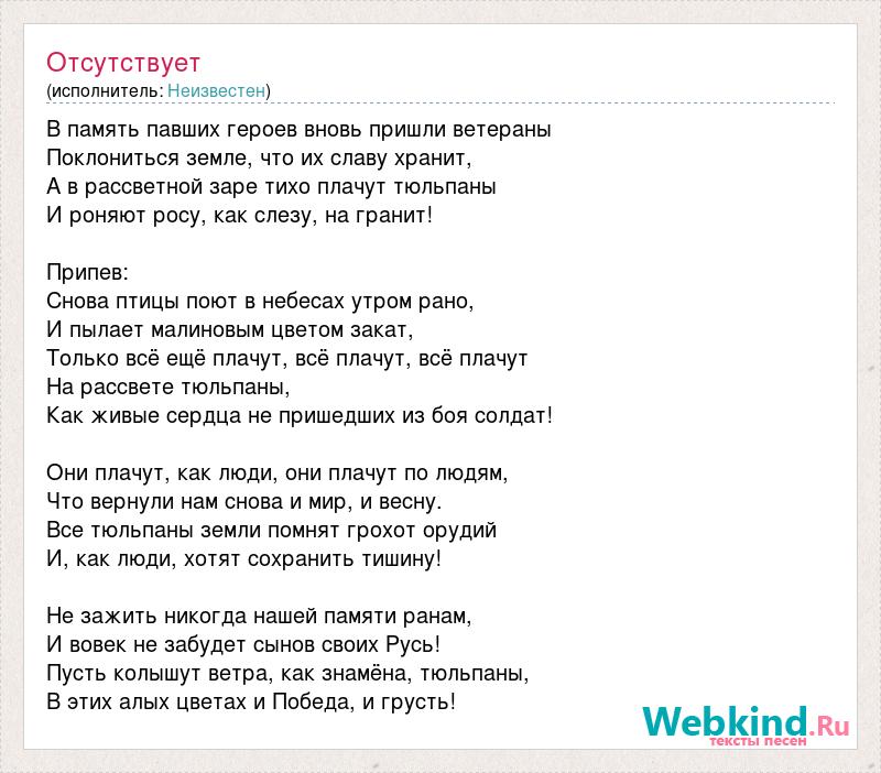 В память павших героев вновь пришли ветераны Поклониться земле, что их славу хранит, А в рассветной заре тихо плачут тюльпаны И роняют росу, как слезу, на гранит! Припев: Снова птицы поют в небесах утром рано, И пылает малиновым цветом закат, Только всё ещё плачут, всё плачут, всё плачут На рассвете тюльпаны, Как живые сердца не пришедших из боя солдат! Они плачут, как люди, они плачут по людям, Что вернули нам снова и мир, и весну. Все тюльпаны земли помнят грохот орудий И, как люди, хотят сохранить тишину! Не зажить никогда нашей памяти ранам, И вовек не забудет сынов своих Русь! Пусть колышут ветра, как знамёна, тюльпаны, В этих алых цветах и Победа, и грусть!