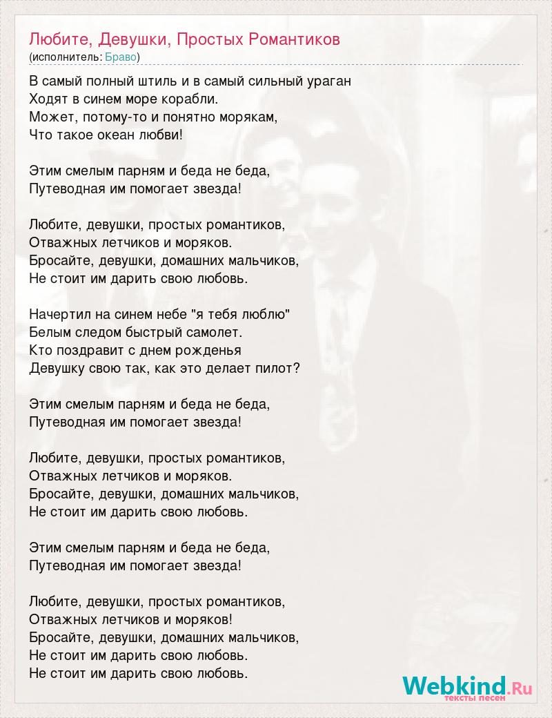 В самый полный штиль и в самый сильный ураган Ходят в синем море корабли. Может, потому-то и понятно морякам, Что такое океан любви! Этим смелым парням и беда не беда, Путеводная им помогает звезда! Любите, девушки, простых романтиков, Отважных летчиков и моряков. Бросайте, девушки, домашних мальчиков, Не стоит им дарить свою любовь. Начертил на синем небе "я тебя люблю" Белым следом быстрый самолет. Кто поздравит с днем рожденья Девушку свою так, как это делает пилот? Этим смелым парням и беда не беда, Путеводная им помогает звезда! Любите, девушки, простых романтиков, Отважных летчиков и моряков. Бросайте, девушки, домашних мальчиков, Не стоит им дарить свою любовь. Этим смелым парням и беда не беда, Путеводная им помогает звезда! Любите, девушки, простых романтиков, Отважных летчиков и моряков! Бросайте, девушки, домашних мальчиков, Не стоит им дарить свою любовь. Не стоит им дарить свою любовь.