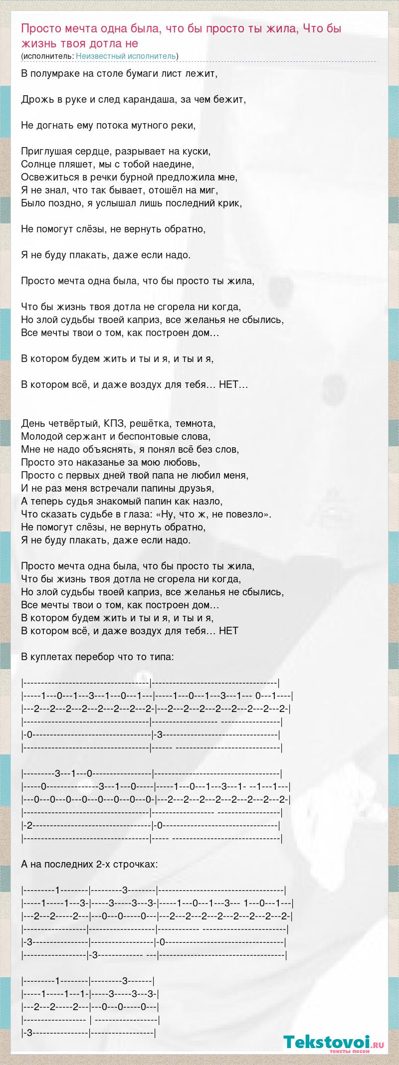 В полумраке на столе бумаги лист лежит, Дрожь в руке и след карандаша, за чем бежит, Не догнать ему потока мутного реки, Приглушая сердце, разрывает на куски, Солнце пляшет, мы с тобой наедине, Освежиться в речки бурной предложила мне, Я не знал, что так бывает, отошёл на миг, Было поздно, я услышал лишь последний крик, Не помогут слёзы, не вернуть обратно, Я не буду плакать, даже если надо. Просто мечта одна была, что бы просто ты жила, Что бы жизнь твоя дотла не сгорела ни когда, Но злой судьбы твоей каприз, все желанья не сбылись, Все мечты твои о том, как построен дом… В котором будем жить и ты и я, и ты и я, В котором всё, и даже воздух для тебя… НЕТ… День четвёртый, КПЗ, решётка, темнота, Молодой сержант и беспонтовые слова, Мне не надо объяснять, я понял всё без слов, Просто это наказанье за мою любовь, Просто с первых дней твой папа не любил меня, И не раз меня встречали папины друзья, А теперь судья знакомый папин как назло, Что сказать судьбе в глаза: «Ну, что ж, не повезло». Не помогут слёзы, не вернуть обратно, Я не буду плакать, даже если надо. Просто мечта одна была, что бы просто ты жила, Что бы жизнь твоя дотла не сгорела ни когда, Но злой судьбы твоей каприз, все желанья не сбылись, Все мечты твои о том, как построен дом… В котором будем жить и ты и я, и ты и я, В котором всё, и даже воздух для тебя… НЕТ В куплетах перебор что то типа: |------------------------------------|------------------------------------| |-----1---0---1---3---1---0---1---|-----1---0---1---3---1--- 0---1----| |---2---2---2---2---2---2---2---2-|---2---2---2---2---2---2---2---2-| |------------------------------------|------------------- -----------------| |-0----------------------------------|-3---------------------------------| |------------------------------------|------ ------------------------------| |---------3---1---0-----------------|------------------------------------| |-----0---------------3---1---0-----|-----1---0---1---3---1- --1---1---| |---0---0---0---0---0---0---0---0-|---2---2---2---2---2---2---2---2-| |------------------------------------|------------------ ------------------| |-2----------------------------------|-0---------------------------------| |------------------------------------|----- -------------------------------| А на последних 2-х строчках: |---------1--------|---------3--------|------------------------------------| |-----1-----1---3-|-----3-----3---3-|-----1---0---1---3--- 1---0---1---| |---2---2-----2---|---0---0-----0---|---2---2---2---2---2---2---2---2-| |------------------|-------------------|------------ ------------------------| |-3----------------|------------------|-0----------------------------------| |------------------|-3------------- ---|------------------------------------| |---------1--------|---------3-------| |-----1-----1---1-|-----3-----3---3-| |---2---2-----2---|---0---0-----0---| |------------------ | ------------------| |-3----------------|------------------|