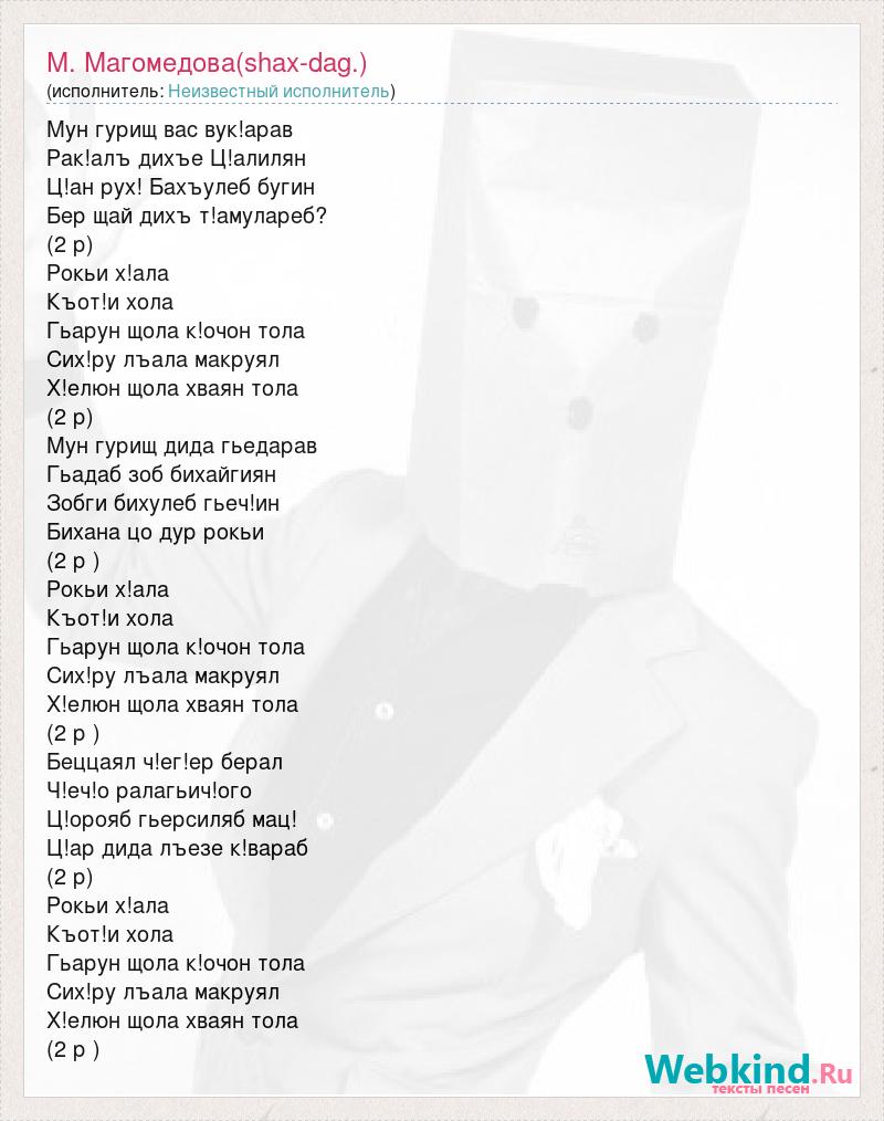 Мун гурищ вас вук!арав Рак!алъ дихъе Ц!алилян Ц!ан рух! Бахъулеб бугин Бер щай дихъ т!амулареб? (2 р) Рокьи х!ала Къот!и хола Гьарун щола к!очон тола Сих!ру лъала макруял Х!елюн щола хваян тола (2 р) Мун гурищ дида гьедарав Гьадаб зоб бихайгиян Зобги бихулеб гьеч!ин Бихана цо дур рокьи (2 р ) Рокьи х!ала Къот!и хола Гьарун щола к!очон тола Сих!ру лъала макруял Х!елюн щола хваян тола (2 р ) Беццаял ч!ег!ер берал Ч!еч!о ралагьич!ого Ц!орояб гьерсиляб мац! Ц!ар дида лъезе к!вараб (2 р) Рокьи х!ала Къот!и хола Гьарун щола к!очон тола Сих!ру лъала макруял Х!елюн щола хваян тола (2 р )