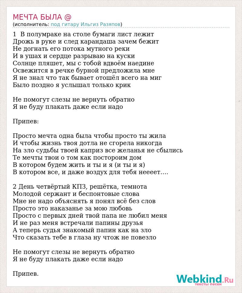 1 В полумраке на столе бумаги лист лежит Дрожь в руке и след карандаша зачем бежит Не догнать его потока мутного реки И в ушах и сердце разрываю на куски Солнце пляшет, мы с тобой вдвоём наедине Освежится в речке бурной предложила мне Я не знал что так бывает отошёл всего на миг Было поздно я услышал только крик Не помогут слезы не вернуть обратно Я не буду плакать даже если надо Припев: Просто мечта одна была чтобы просто ты жила И чтобы жизнь твоя дотла не сгорела никогда На зло судьбы твоей каприз все желанья не сбылись Те мечты твои о том как постороим дом В котором будем жить и ты и я (и ты и я) В котором все, и даже воздух для тебя неееет…. 2 День четвёртый КПЗ, решётка, темнота Молодой сержант и беспонтовые слова Мне не надо объяснять я понял всё без слов Просто это наказанье за мою любовь Просто с первых дней твой папа не любил меня И не раз меня встречали папины друзья А теперь судья знакомый папин как на зло Что сказать тебе в глаза ну чтож не повезло Не помогут слезы не вернуть обратно Я не буду плакать даже если надо Припев.