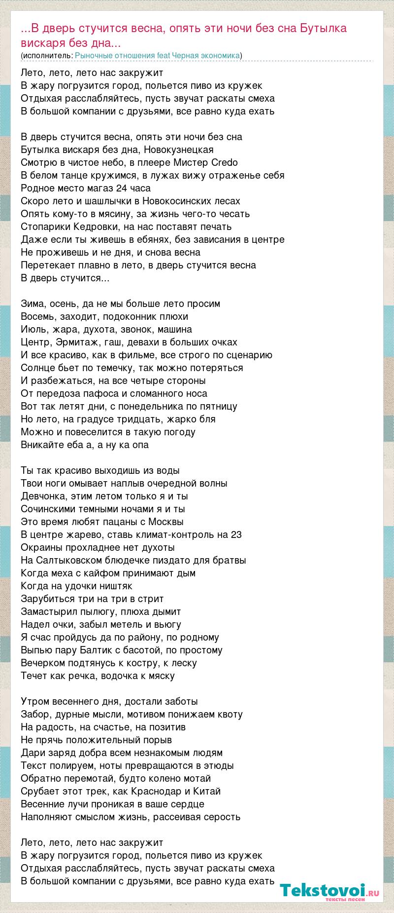 Лето, лето, лето нас закружит В жару погрузится город, польется пиво из кружек Отдыхая расслабляйтесь, пусть звучат раскаты смеха В большой компании с друзьями, все равно куда ехать В дверь стучится весна, опять эти ночи без сна Бутылка вискаря без дна, Новокузнецкая Смотрю в чистое небо, в плеере Мистер Credo В белом танце кружимся, в лужах вижу отраженье себя Родное место магаз 24 часа Скоро лето и шашлычки в Новокосинских лесах Опять кому-то в мясину, за жизнь чего-то чесать Стопарики Кедровки, на нас поставят печать Даже если ты живешь в ебянях, без зависания в центре Не проживешь и не дня, и снова весна Перетекает плавно в лето, в дверь стучится весна В дверь стучится... Зима, осень, да не мы больше лето просим Восемь, заходит, подоконник плюхи Июль, жара, духота, звонок, машина Центр, Эрмитаж, гаш, девахи в больших очках И все красиво, как в фильме, все строго по сценарию Солнце бьет по темечку, так можно потеряться И разбежаться, на все четыре стороны От передоза пафоса и сломанного носа Вот так летят дни, с понедельника по пятницу Но лето, на градусе тридцать, жарко бля Можно и повеселится в такую погоду Вникайте еба а, а ну ка опа Ты так красиво выходишь из воды Твои ноги омывает наплыв очередной волны Девчонка, этим летом только я и ты Сочинскими темными ночами я и ты Это время любят пацаны с Москвы В центре жарево, ставь климат-контроль на 23 Окраины прохладнее нет духоты На Салтыковском блюдечке пиздато для братвы Когда меха с кайфом принимают дым Когда на удочки ништяк Зарубиться три на три в стрит Замастырил пылюгу, плюха дымит Надел очки, забыл метель и вьюгу Я счас пройдусь да по району, по родному Выпью пару Балтик с басотой, по простому Вечерком подтянусь к костру, к леску Течет как речка, водочка к мяску Утром весеннего дня, достали заботы Забор, дурные мысли, мотивом понижаем квоту На радость, на счастье, на позитив Не прячь положительный порыв Дари заряд добра всем незнакомым людям Текст полируем, ноты превращаются в этюды Обратно перемотай, будто колено мотай Срубает этот трек, как Краснодар и Китай Весенние лучи проникая в ваше сердце Наполняют смыслом жизнь, рассеивая серость Лето, лето, лето нас закружит В жару погрузится город, польется пиво из кружек Отдыхая расслабляйтесь, пусть звучат раскаты смеха В большой компании с друзьями, все равно куда ехать