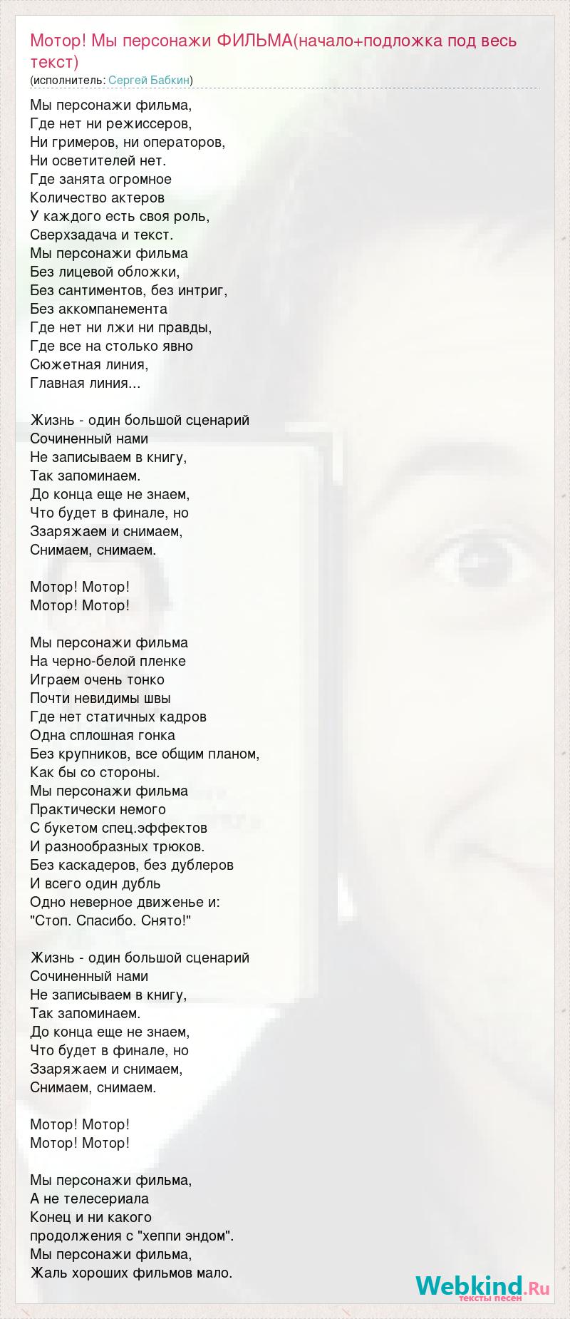 Мы персонажи фильма, Где нет ни режиссеров, Ни гримеров, ни операторов, Ни осветителей нет. Где занята огромное Количество актеров У каждого есть своя роль, Сверхзадача и текст. Мы персонажи фильма Без лицевой обложки, Без сантиментов, без интриг, Без аккомпанемента Где нет ни лжи ни правды, Где все на столько явно Сюжетная линия, Главная линия... Жизнь - один большой сценарий Сочиненный нами Не записываем в книгу, Так запоминаем. До конца еще не знаем, Что будет в финале, но Ззаряжаем и снимаем, Снимаем, снимаем. Мотор! Мотор! Мотор! Мотор! Мы персонажи фильма На черно-белой пленке Играем очень тонко Почти невидимы швы Где нет статичных кадров Одна сплошная гонка Без крупников, все общим планом, Как бы со стороны. Мы персонажи фильма Практически немого С букетом спец.эффектов И разнообразных трюков. Без каскадеров, без дублеров И всего один дубль Одно неверное движенье и: "Стоп. Спасибо. Снято!" Жизнь - один большой сценарий Сочиненный нами Не записываем в книгу, Так запоминаем. До конца еще не знаем, Что будет в финале, но Ззаряжаем и снимаем, Снимаем, снимаем. Мотор! Мотор! Мотор! Мотор! Мы персонажи фильма, А не телесериала Конец и ни какого продолжения с "хеппи эндом". Мы персонажи фильма, Жаль хороших фильмов мало.