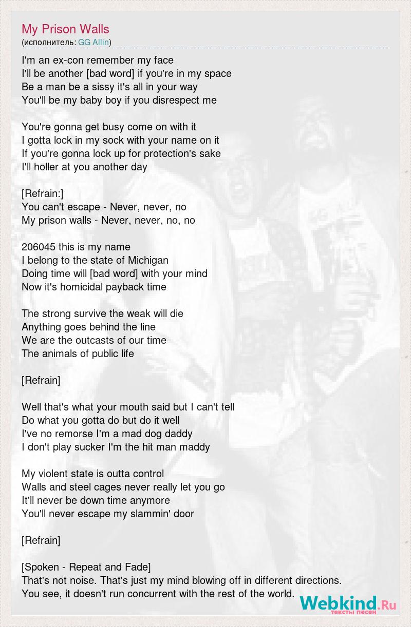 I'm an ex-con remember my face I'll be another [bad word] if you're in my space Be a man be a sissy it's all in your way You'll be my baby boy if you disrespect me You're gonna get busy come on with it I gotta lock in my sock with your name on it If you're gonna lock up for protection's sake I'll holler at you another day [Refrain:] You can't escape - Never, never, no My prison walls - Never, never, no, no 206045 this is my name I belong to the state of Michigan Doing time will [bad word] with your mind Now it's homicidal payback time The strong survive the weak will die Anything goes behind the line We are the outcasts of our time The animals of public life [Refrain] Well that's what your mouth said but I can't tell Do what you gotta do but do it well I've no remorse I'm a mad dog daddy I don't play sucker I'm the hit man maddy My violent state is outta control Walls and steel cages never really let you go It'll never be down time anymore You'll never escape my slammin' door [Refrain] [Spoken - Repeat and Fade] That's not noise. That's just my mind blowing off in different directions. You see, it doesn't run concurrent with the rest of the world.
