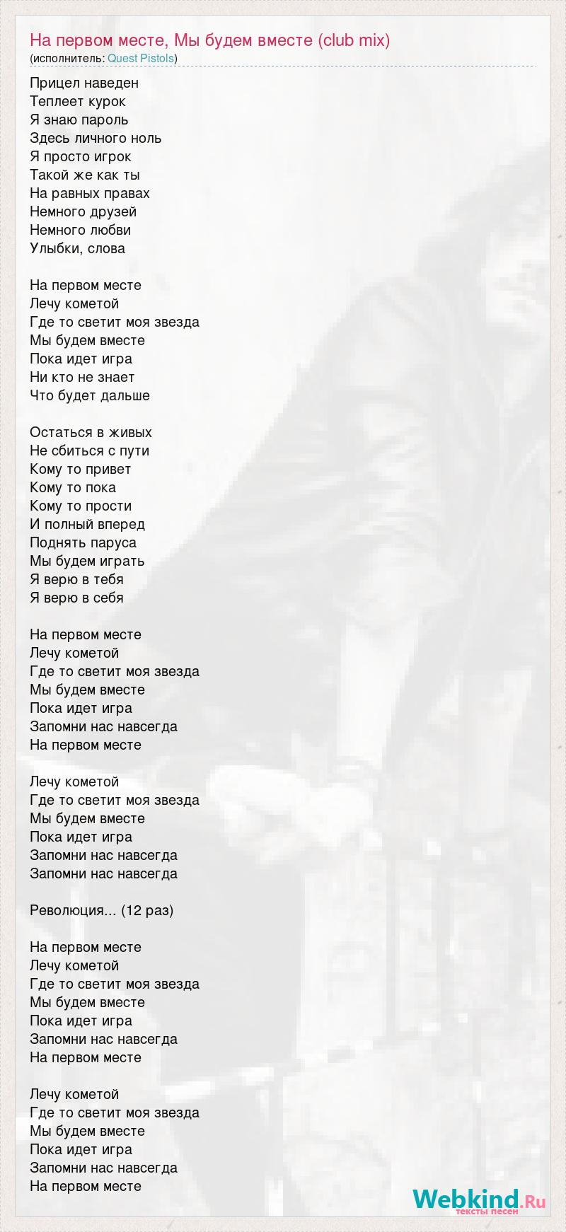 Прицел наведен Теплеет курок Я знаю пароль Здесь личного ноль Я просто игрок Такой же как ты На равных правах Немного друзей Немного любви Улыбки, слова На первом месте Лечу кометой Где то светит моя звезда Мы будем вместе Пока идет игра Ни кто не знает Что будет дальше Остаться в живых Не сбиться с пути Кому то привет Кому то пока Кому то прости И полный вперед Поднять паруса Мы будем играть Я верю в тебя Я верю в себя На первом месте Лечу кометой Где то светит моя звезда Мы будем вместе Пока идет игра Запомни нас навсегда На первом месте Лечу кометой Где то светит моя звезда Мы будем вместе Пока идет игра Запомни нас навсегда Запомни нас навсегда Революция... (12 раз) На первом месте Лечу кометой Где то светит моя звезда Мы будем вместе Пока идет игра Запомни нас навсегда На первом месте Лечу кометой Где то светит моя звезда Мы будем вместе Пока идет игра Запомни нас навсегда На первом месте