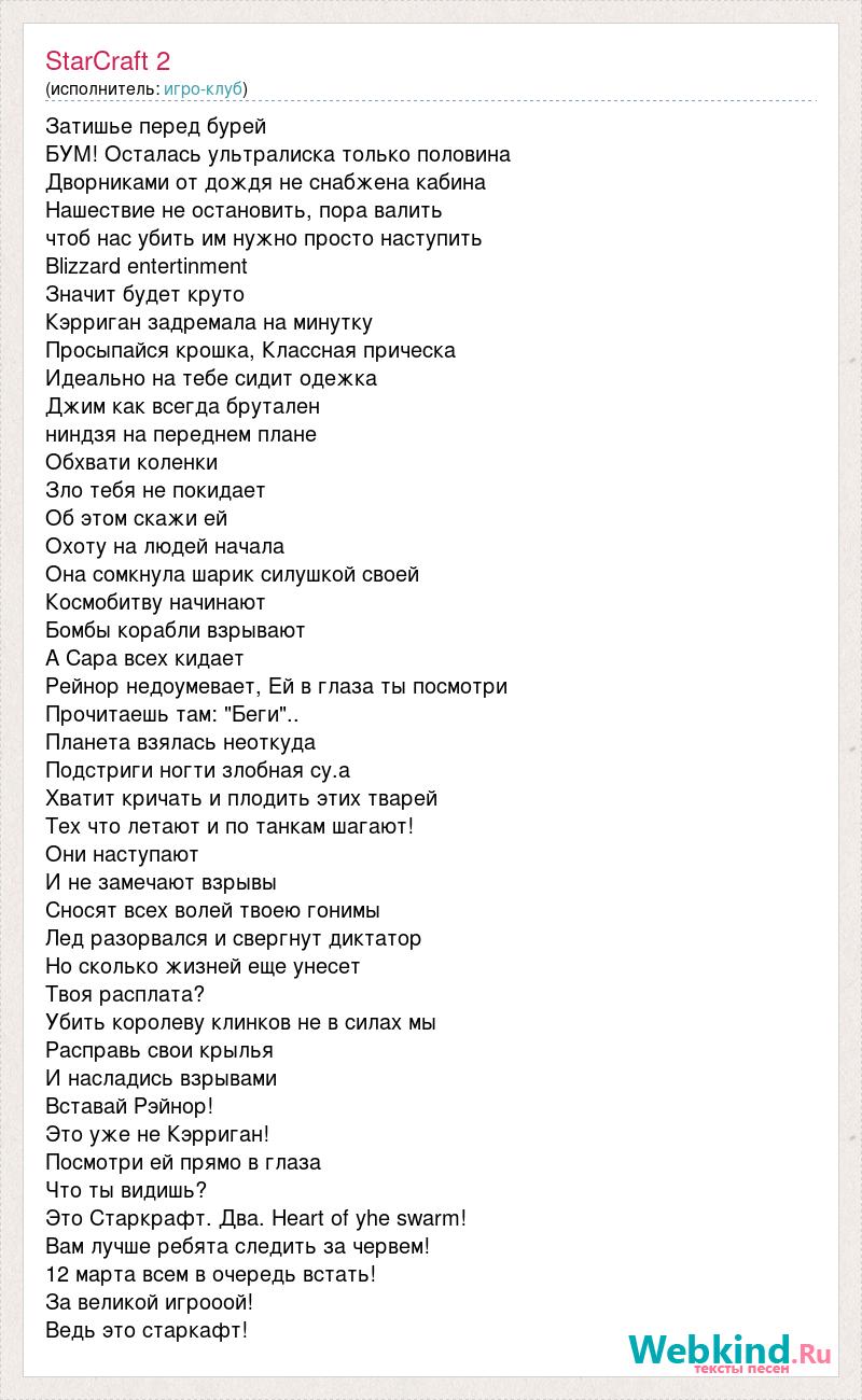 Затишье перед бурей БУМ! Осталась ультралиска только половина Дворниками от дождя не снабжена кабина Нашествие не остановить, пора валить чтоб нас убить им нужно просто наступить Blizzard entertinment Значит будет круто Кэрриган задремала на минутку Просыпайся крошка, Классная прическа Идеально на тебе сидит одежка Джим как всегда брутален ниндзя на переднем плане Обхвати коленки Зло тебя не покидает Об этом скажи ей Охоту на людей начала Она сомкнула шарик силушкой своей Космобитву начинают Бомбы корабли взрывают А Сара всех кидает Рейнор недоумевает, Ей в глаза ты посмотри Прочитаешь там: "Беги".. Планета взялась неоткуда Подстриги ногти злобная су.а Хватит кричать и плодить этих тварей Тех что летают и по танкам шагают! Они наступают И не замечают взрывы Сносят всех волей твоею гонимы Лед разорвался и свергнут диктатор Но сколько жизней еще унесет Твоя расплата? Убить королеву клинков не в силах мы Расправь свои крылья И насладись взрывами Вставай Рэйнор! Это уже не Кэрриган! Посмотри ей прямо в глаза Что ты видишь? Это Старкрафт. Два. Heart of yhe swarm! Вам лучше ребята следить за червем! 12 марта всем в очередь встать! За великой игрооой! Ведь это старкафт!