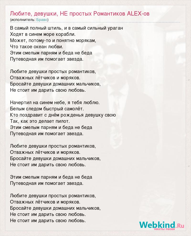 В самый полный штиль, и в самый сильный ураган Ходят в синем море корабли. Может, потому-то и понятно морякам, Что такое океан любви. Этим смелым парням и беда не беда Путеводная им помогает звезда. Любите девушки простых романтиков, Отважных лётчиков и моряков. Бросайте девушки домашних мальчиков, Не стоит им дарить свою любовь. Начертил на синем небе, я тебя люблю. Белым следом быстрый самолёт. Кто поздравит с днём рожденья девушку свою Так, как это делает пилот. Этим смелым парням и беда не беда Путеводная им помогает звезда. Любите девушки простых романтиков, Отважных лётчиков и моряков. Бросайте девушки домашних мальчиков, Не стоит им дарить свою любовь. Этим смелым парням и беда не беда Путеводная им помогает звезда. Любите девушки простых романтиков, Отважных лётчиков и моряков. Бросайте девушки домашних мальчиков, Не стоит им дарить свою любовь. Не стоит им дарить свою любовь.