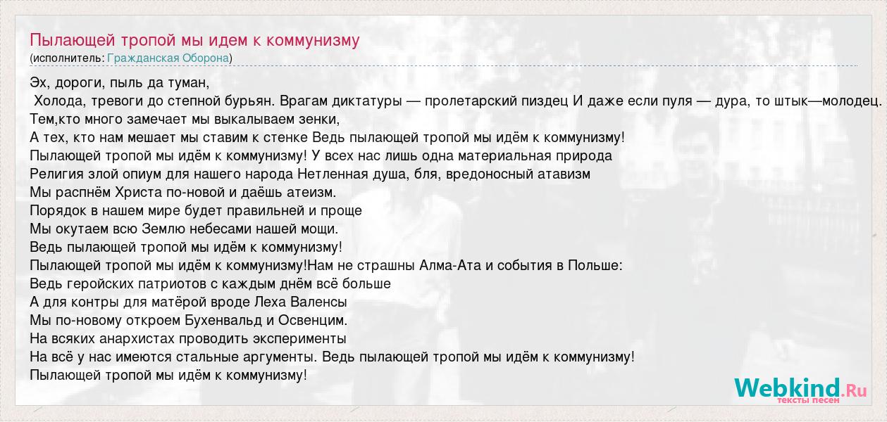 Эх, дороги, пыль да туман, Холода, тревоги до степной бурьян. Врагам диктатуры — пролетарский пиздец И даже если пуля — дура, то штык—молодец. Тем,кто много замечает мы выкалываем зенки, А тех, кто нам мешает мы ставим к стенке Ведь пылающей тропой мы идём к коммунизму! Пылающей тропой мы идём к коммунизму! У всех нас лишь одна материальная природа Религия злой опиум для нашего народа Нетленная душа, бля, вредоносный атавизм Мы распнём Христа по-новой и даёшь атеизм. Порядок в нашем мире будет правильней и проще Мы окутаем всю Землю небесами нашей мощи. Ведь пылающей тропой мы идём к коммунизму! Пылающей тропой мы идём к коммунизму!Нам не страшны Алма-Ата и события в Польше: Ведь геройских патриотов с каждым днём всё больше А для контры для матёрой вроде Леха Валенсы Мы по-новому откроем Бухенвальд и Освенцим. На всяких анархистах проводить эксперименты На всё у нас имеются стальные аргументы. Ведь пылающей тропой мы идём к коммунизму! Пылающей тропой мы идём к коммунизму!