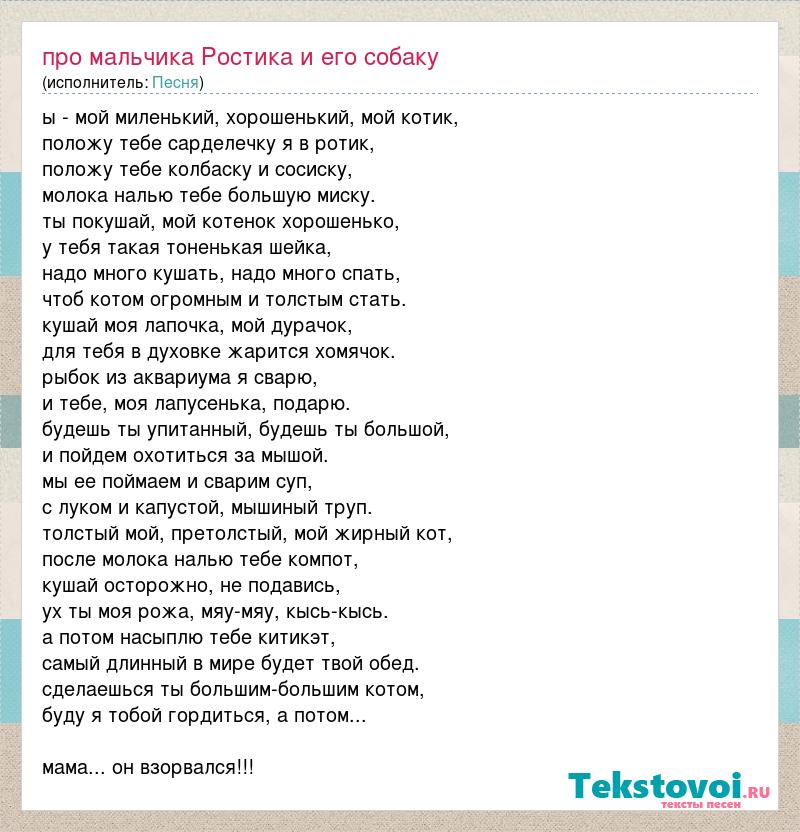 ы - мой миленький, хорошенький, мой котик, положу тебе сарделечку я в ротик, положу тебе колбаску и сосиску, молока налью тебе большую миску. ты покушай, мой котенок хорошенько, у тебя такая тоненькая шейка, надо много кушать, надо много спать, чтоб котом огромным и толстым стать. кушай моя лапочка, мой дурачок, для тебя в духовке жарится хомячок. рыбок из аквариума я сварю, и тебе, моя лапусенька, подарю. будешь ты упитанный, будешь ты большой, и пойдем охотиться за мышой. мы ее поймаем и сварим суп, с луком и капустой, мышиный труп. толстый мой, претолстый, мой жирный кот, после молока налью тебе компот, кушай осторожно, не подавись, ух ты моя рожа, мяу-мяу, кысь-кысь. а потом насыплю тебе китикэт, самый длинный в мире будет твой обед. сделаешься ты большим-большим котом, буду я тобой гордиться, а потом... мама... он взорвался!!!