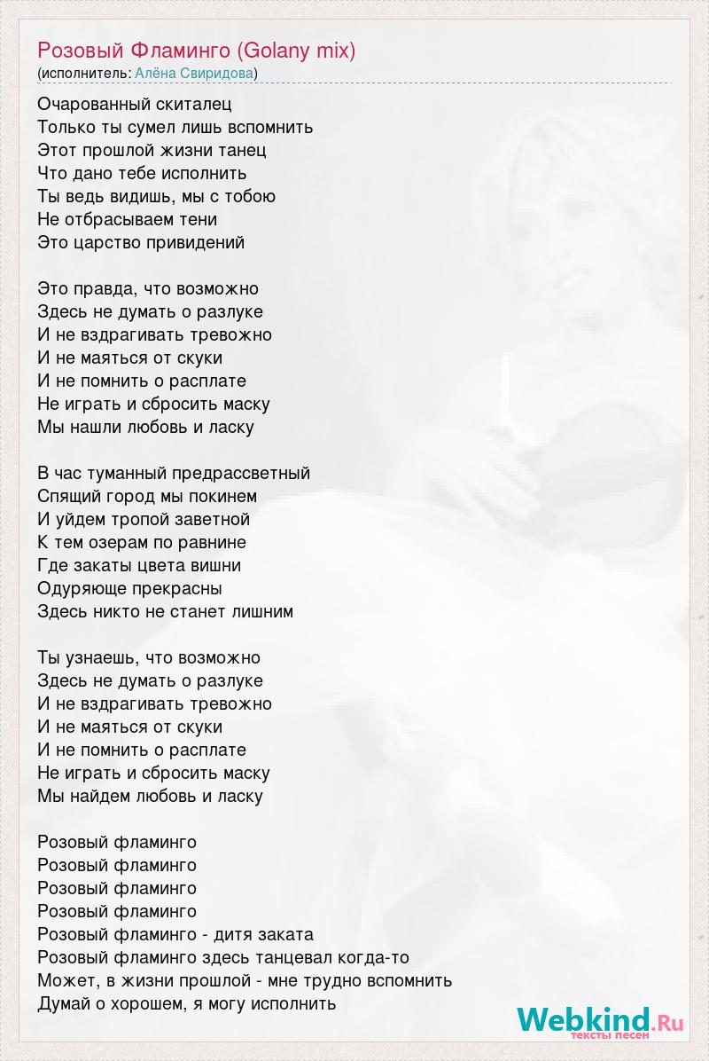 Очарованный скиталец Только ты сумел лишь вспомнить Этот прошлой жизни танец Что дано тебе исполнить Ты ведь видишь, мы с тобою Не отбрасываем тени Это царство привидений Это правда, что возможно Здесь не думать о разлуке И не вздрагивать тревожно И не маяться от скуки И не помнить о расплате Не играть и сбросить маску Мы нашли любовь и ласку В час туманный предрассветный Спящий город мы покинем И уйдем тропой заветной К тем озерам по равнине Где закаты цвета вишни Одуряюще прекрасны Здесь никто не станет лишним Ты узнаешь, что возможно Здесь не думать о разлуке И не вздрагивать тревожно И не маяться от скуки И не помнить о расплате Не играть и сбросить маску Мы найдем любовь и ласку Розовый фламинго Розовый фламинго Розовый фламинго Розовый фламинго Розовый фламинго - дитя заката Розовый фламинго здесь танцевал когда-то Может, в жизни прошлой - мне трудно вспомнить Думай о хорошем, я могу исполнить