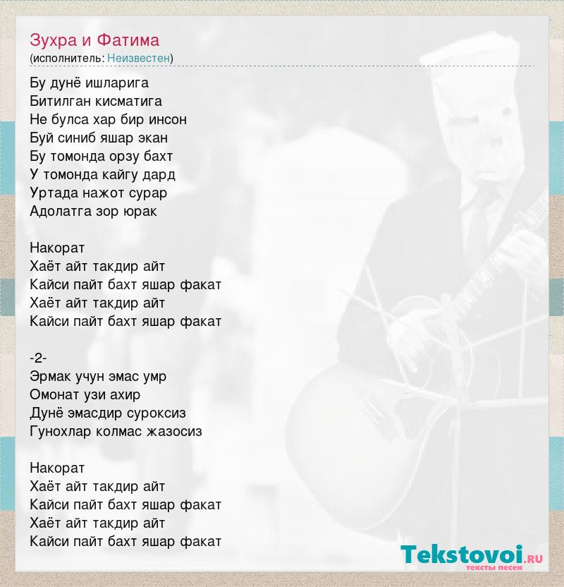 Бу дунё ишларига Битилган кисматига Не булса хар бир инсон Буй синиб яшар экан Бу томонда орзу бахт У томонда кайгу дард Уртада нажот сурар Адолатга зор юрак Накорат Хаёт айт такдир айт Кайси пайт бахт яшар факат Хаёт айт такдир айт Кайси пайт бахт яшар факат -2- Эрмак учун эмас умр Омонат узи ахир Дунё эмасдир суроксиз Гунохлар колмас жазосиз Накорат Хаёт айт такдир айт Кайси пайт бахт яшар факат Хаёт айт такдир айт Кайси пайт бахт яшар факат