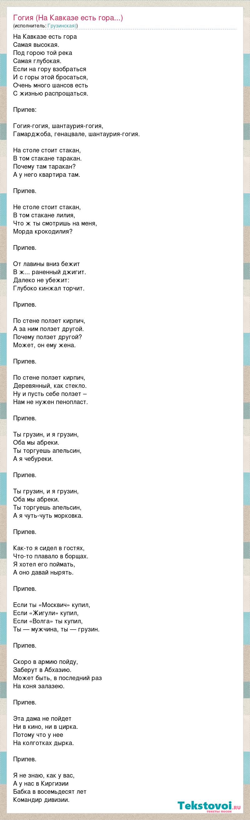 На Кавказе есть гора Самая высокая. Под горою той река Самая глубокая. Если на гору взобраться И с горы этой бросаться, Очень много шансов есть С жизнью распрощаться. Припев: Гогия-гогия, шантаурия-гогия, Гамарджоба, генацвале, шантаурия-гогия. На столе стоит стакан, В том стакане таракан. Почему там таракан? А у него квартира там. Припев. Не столе стоит стакан, В том стакане лилия, Что ж ты смотришь на меня, Морда крокодилия? Припев. От лавины вниз бежит В ж... раненный джигит. Далеко не убежит: Глубоко кинжал торчит. Припев. По стене ползет кирпич, А за ним ползет другой. Почему ползет другой? Может, он ему жена. Припев. По стене ползет кирпич, Деревянный, как стекло. Ну и пусть себе ползет – Нам не нужен пенопласт. Припев. Ты грузин, и я грузин, Оба мы абреки. Ты торгуешь апельсин, А я чебуреки. Припев. Ты грузин, и я грузин, Оба мы абреки. Ты торгуешь апельсин, А я чуть-чуть морковка. Припев. Как-то я сидел в гостях, Что-то плавало в борщах. Я хотел его поймать, А оно давай нырять. Припев. Если ты «Москвич» купил, Если «Жигули» купил, Если «Волга» ты купил, Ты — мужчина, ты — грузин. Припев. Скоро в армию пойду, Заберут в Абхазию. Может быть, в последний раз На коня залазею. Припев. Эта дама не пойдет Ни в кино, ни в цирка. Потому что у нее На колготках дырка. Припев. Я не знаю, как у вас, А у нас в Киргизии Бабка в восемьдесят лет Командир дивизии.