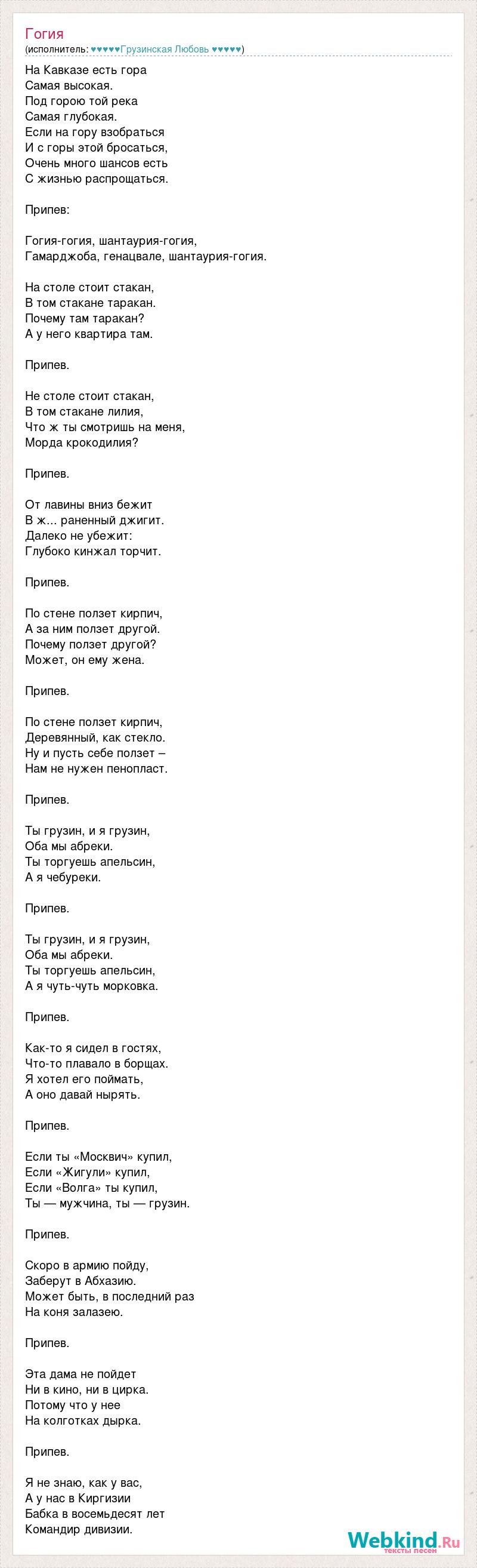 На Кавказе есть гора Самая высокая. Под горою той река Самая глубокая. Если на гору взобраться И с горы этой бросаться, Очень много шансов есть С жизнью распрощаться. Припев: Гогия-гогия, шантаурия-гогия, Гамарджоба, генацвале, шантаурия-гогия. На столе стоит стакан, В том стакане таракан. Почему там таракан? А у него квартира там. Припев. Не столе стоит стакан, В том стакане лилия, Что ж ты смотришь на меня, Морда крокодилия? Припев. От лавины вниз бежит В ж... раненный джигит. Далеко не убежит: Глубоко кинжал торчит. Припев. По стене ползет кирпич, А за ним ползет другой. Почему ползет другой? Может, он ему жена. Припев. По стене ползет кирпич, Деревянный, как стекло. Ну и пусть себе ползет – Нам не нужен пенопласт. Припев. Ты грузин, и я грузин, Оба мы абреки. Ты торгуешь апельсин, А я чебуреки. Припев. Ты грузин, и я грузин, Оба мы абреки. Ты торгуешь апельсин, А я чуть-чуть морковка. Припев. Как-то я сидел в гостях, Что-то плавало в борщах. Я хотел его поймать, А оно давай нырять. Припев. Если ты «Москвич» купил, Если «Жигули» купил, Если «Волга» ты купил, Ты — мужчина, ты — грузин. Припев. Скоро в армию пойду, Заберут в Абхазию. Может быть, в последний раз На коня залазею. Припев. Эта дама не пойдет Ни в кино, ни в цирка. Потому что у нее На колготках дырка. Припев. Я не знаю, как у вас, А у нас в Киргизии Бабка в восемьдесят лет Командир дивизии.