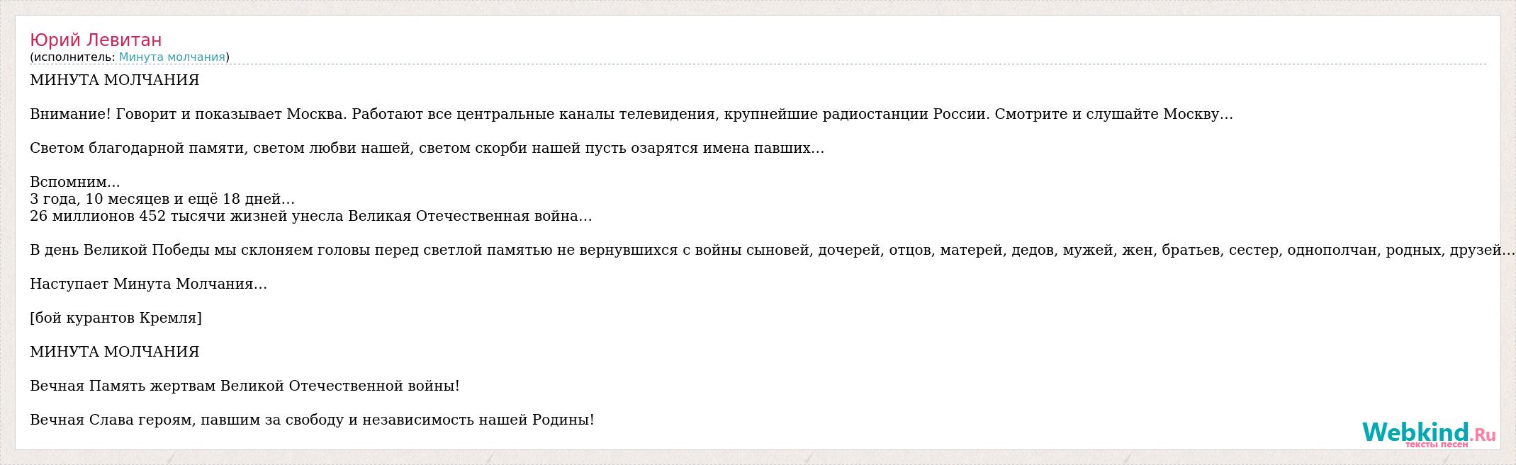 МИНУТА МОЛЧАНИЯ Внимание! Говорит и показывает Москва. Работают все центральные каналы телевидения, крупнейшие радиостанции России. Смотрите и слушайте Москву… Светом благодарной памяти, светом любви нашей, светом скорби нашей пусть озарятся имена павших… Вспомним... 3 года, 10 месяцев и ещё 18 дней… 26 миллионов 452 тысячи жизней унесла Великая Отечественная война… В день Великой Победы мы склоняем головы перед светлой памятью не вернувшихся с войны сыновей, дочерей, отцов, матерей, дедов, мужей, жен, братьев, сестер, однополчан, родных, друзей… Наступает Минута Молчания… [бой курантов Кремля] МИНУТА МОЛЧАНИЯ Вечная Память жертвам Великой Отечественной войны! Вечная Слава героям, павшим за свободу и независимость нашей Родины!