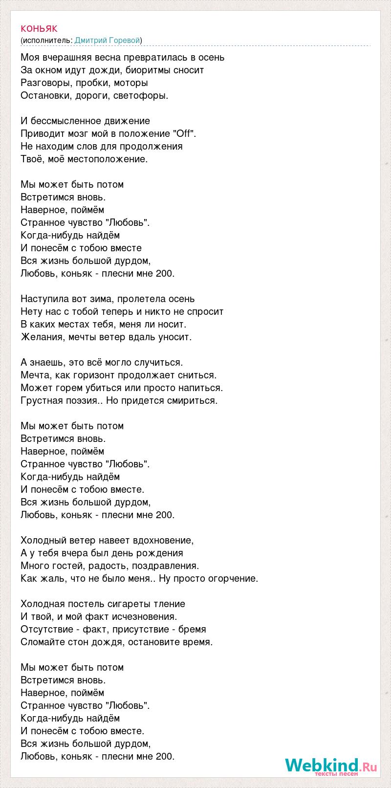 Моя вчерашняя весна превратилась в осень За окном идут дожди, биоритмы сносит Разговоры, пробки, моторы Остановки, дороги, светофоры. И бессмысленное движение Приводит мозг мой в положение "Off". Не находим слов для продолжения Твоё, моё местоположение. Мы может быть потом Встретимся вновь. Наверное, поймём Странное чувство "Любовь". Когда-нибудь найдём И понесём с тобою вместе Вся жизнь большой дурдом, Любовь, коньяк - плесни мне 200. Наступила вот зима, пролетела осень Нету нас с тобой теперь и никто не спросит В каких местах тебя, меня ли носит. Желания, мечты ветер вдаль уносит. А знаешь, это всё могло случиться. Мечта, как горизонт продолжает сниться. Может горем убиться или просто напиться. Грустная поэзия.. Но придется смириться. Мы может быть потом Встретимся вновь. Наверное, поймём Странное чувство "Любовь". Когда-нибудь найдём И понесём с тобою вместе. Вся жизнь большой дурдом, Любовь, коньяк - плесни мне 200. Холодный ветер навеет вдохновение, А у тебя вчера был день рождения Много гостей, радость, поздравления. Как жаль, что не было меня.. Ну просто огорчение. Холодная постель сигареты тление И твой, и мой факт исчезновения. Отсутствие - факт, присутствие - бремя Сломайте стон дождя, остановите время. Мы может быть потом Встретимся вновь. Наверное, поймём Странное чувство "Любовь". Когда-нибудь найдём И понесём с тобою вместе. Вся жизнь большой дурдом, Любовь, коньяк - плесни мне 200.