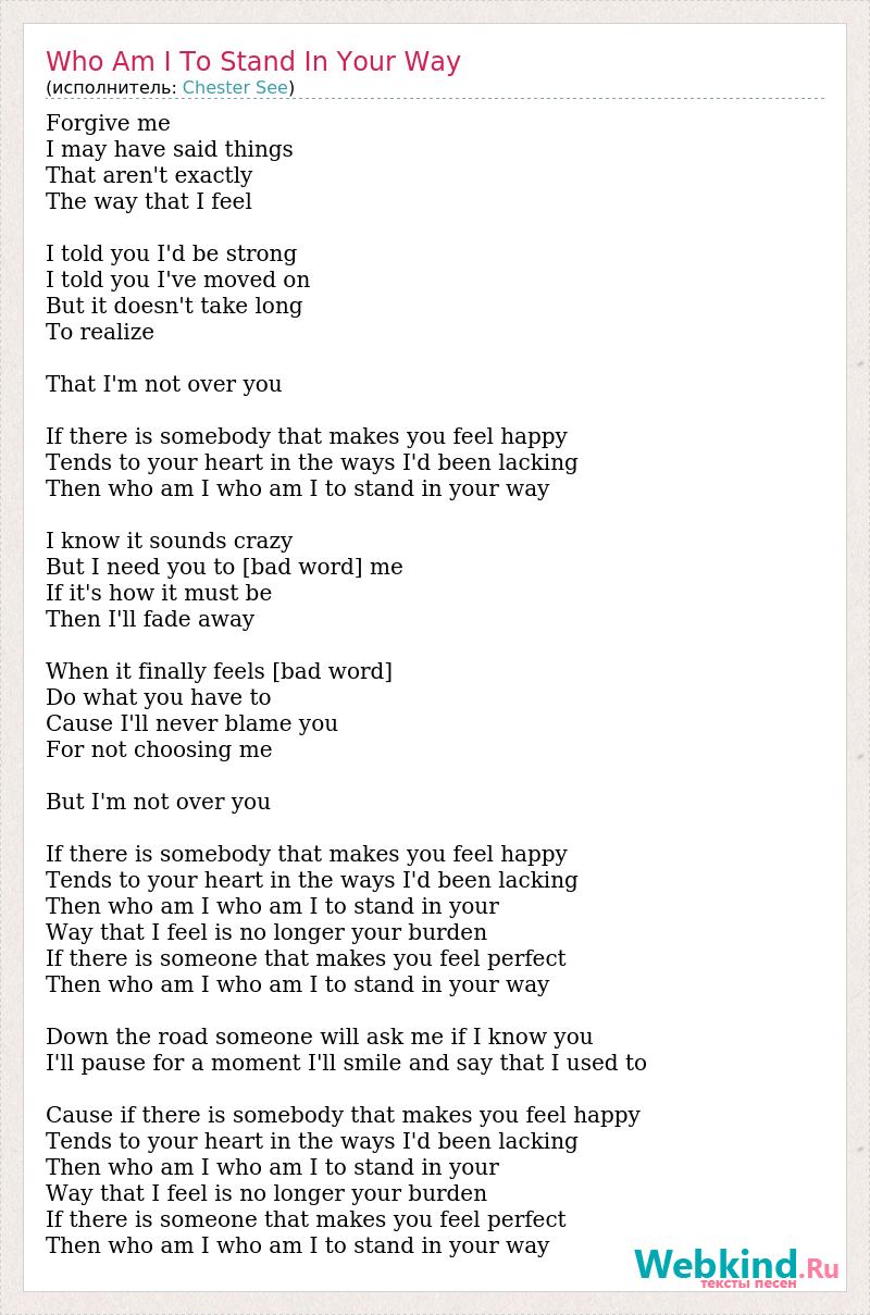 Forgive me I may have said things That aren't exactly The way that I feel I told you I'd be strong I told you I've moved on But it doesn't take long To realize That I'm not over you If there is somebody that makes you feel happy Tends to your heart in the ways I'd been lacking Then who am I who am I to stand in your way I know it sounds crazy But I need you to [bad word] me If it's how it must be Then I'll fade away When it finally feels [bad word] Do what you have to Cause I'll never blame you For not choosing me But I'm not over you If there is somebody that makes you feel happy Tends to your heart in the ways I'd been lacking Then who am I who am I to stand in your Way that I feel is no longer your burden If there is someone that makes you feel perfect Then who am I who am I to stand in your way Down the road someone will ask me if I know you I'll pause for a moment I'll smile and say that I used to Cause if there is somebody that makes you feel happy Tends to your heart in the ways I'd been lacking Then who am I who am I to stand in your Way that I feel is no longer your burden If there is someone that makes you feel perfect Then who am I who am I to stand in your way