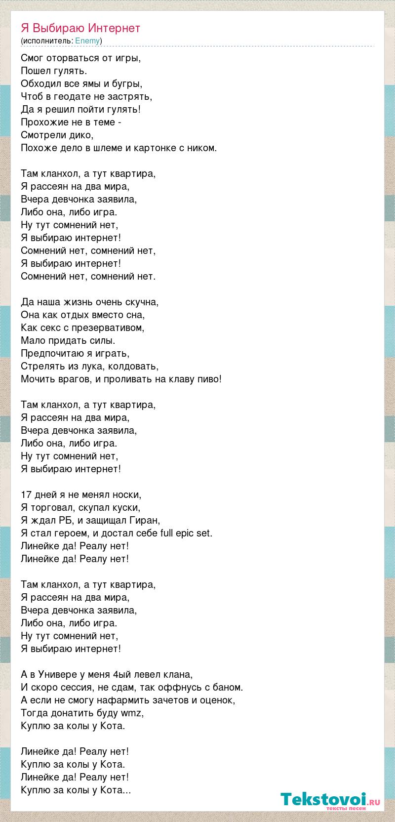 Смог оторваться от игры, Пошел гулять. Обходил все ямы и бугры, Чтоб в геодате не застрять, Да я решил пойти гулять! Прохожие не в теме - Смотрели дико, Похоже дело в шлеме и картонке с ником. Там кланхол, а тут квартира, Я рассеян на два мира, Вчера девчонка заявила, Либо она, либо игра. Ну тут сомнений нет, Я выбираю интернет! Сомнений нет, сомнений нет, Я выбираю интернет! Сомнений нет, сомнений нет. Да наша жизнь очень скучна, Она как отдых вместо сна, Как секс с презервативом, Мало придать силы. Предпочитаю я играть, Стрелять из лука, колдовать, Мочить врагов, и проливать на клаву пиво! Там кланхол, а тут квартира, Я рассеян на два мира, Вчера девчонка заявила, Либо она, либо игра. Ну тут сомнений нет, Я выбираю интернет! 17 дней я не менял носки, Я торговал, скупал куски, Я ждал РБ, и защищал Гиран, Я стал героем, и достал себе full epic set. Линейке да! Реалу нет! Линейке да! Реалу нет! Там кланхол, а тут квартира, Я рассеян на два мира, Вчера девчонка заявила, Либо она, либо игра. Ну тут сомнений нет, Я выбираю интернет! А в Универе у меня 4ый левел клана, И скоро сессия, не сдам, так оффнусь с баном. А если не смогу нафармить зачетов и оценок, Тогда донатить буду wmz, Куплю за колы у Кота. Линейке да! Реалу нет! Куплю за колы у Кота. Линейке да! Реалу нет! Куплю за колы у Кота...