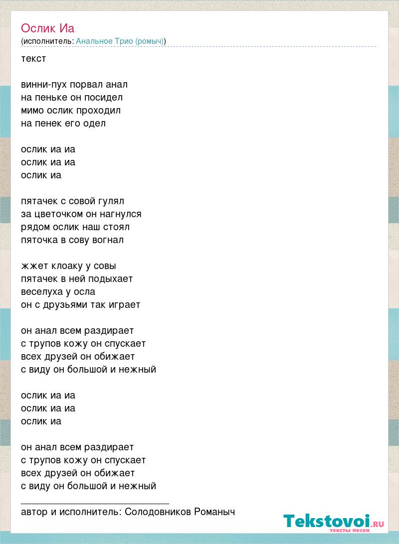 текст винни-пух порвал анал на пеньке он посидел мимо ослик проходил на пенек его одел ослик иа иа ослик иа иа ослик иа пятачек с совой гулял за цветочком он нагнулся рядом ослик наш стоял пяточка в сову вогнал жжет клоаку у совы пятачек в ней подыхает веселуха у осла он с друзьями так играет он анал всем раздирает с трупов кожу он спускает всех друзей он обижает с виду он большой и нежный ослик иа иа ослик иа иа ослик иа он анал всем раздирает с трупов кожу он спускает всех друзей он обижает с виду он большой и нежный ___________________________ автор и исполнитель: Солодовников Романыч