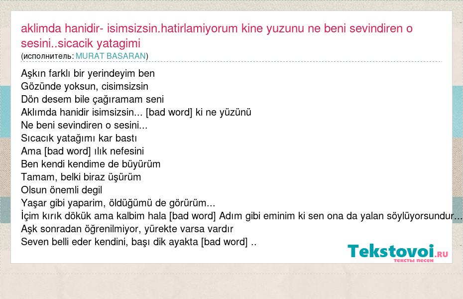 Aklimda hanidir- isimsizsin.hatirlamiyorum kine yuzunu ne beni sevindiren