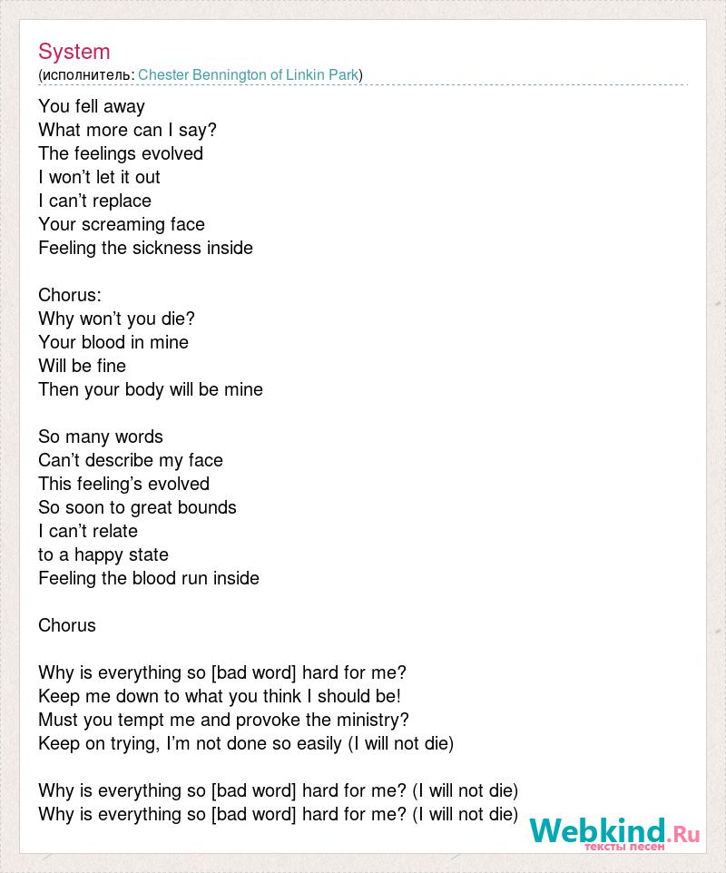 You fell away What more can I say? The feelings evolved I won’t let it out I can’t replace Your screaming face Feeling the sickness inside Chorus: Why won’t you die? Your blood in mine Will be fine Then your body will be mine So many words Can’t describe my face This feeling’s evolved So soon to great bounds I can’t relate to a happy state Feeling the blood run inside Chorus Why is everything so [bad word] hard for me? Keep me down to what you think I should be! Must you tempt me and provoke the ministry? Keep on trying, I’m not done so easily (I will not die) Why is everything so [bad word] hard for me? (I will not die) Why is everything so [bad word] hard for me? (I will not die)
