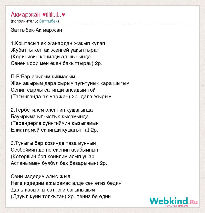 Заттыбек-Ак маржан 1.Коштасып ек жанардан жакып кулап Жубатты кеп ак женгей уакыттырап (Коринисин конилди ал шынында Сенен кори мен екен бакыттырак) 2р. П-В:Бар асылым киймасым Жан ашырым дара сырым туп-тунык кара шыгым Сенин сырлы сатинди ансадым гой (Тагынганда ак маржан) 2р. дала жырым 2.Тербетилем оленнин кушагында Бауырыма ып-ыстык кысамында (Терендерге суйнгиймин кызыгамын Еликтирмей екпинди кушагынга) 2р. 3.Туныгы бар козинде таза муннын Сезбеймин де не екенин азабымнын (Когершин боп конилим алып ушар Аспаныммен булбул бак базарынын) 2р. Сени издедим алыс жыл Неге издедим ажырамас алде сен егиз бедин Даль казыргы саттеги сагынышым (Дауыл куни толкыган) 2р. тениз бе един