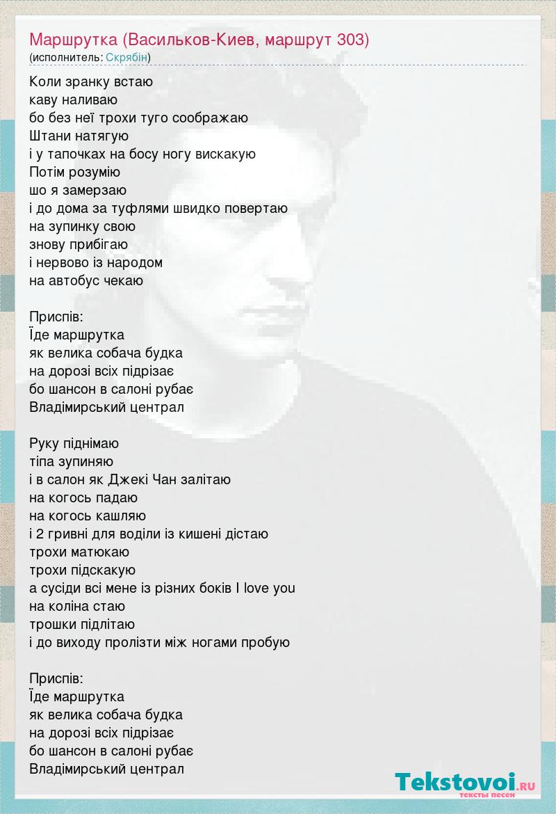 Коли зранку встаю каву наливаю бо без неї трохи туго соображаю Штани натягую і у тапочках на босу ногу вискакую Потім розумію шо я замерзаю і до дома за туфлями швидко повертаю на зупинку свою знову прибігаю і нервово із народом на автобус чекаю Приспів: Їде маршрутка як велика собача будка на дорозі всіх підрізає бо шансон в салоні рубає Владімирський централ Руку піднімаю тіпа зупиняю і в салон як Джекі Чан залітаю на когось падаю на когось кашляю і 2 гривні для воділи із кишені дістаю трохи матюкаю трохи підскакую а сусіди всі мене із різних боків I love you на коліна стаю трошки підлітаю і до виходу пролізти між ногами пробую Приспів: Їде маршрутка як велика собача будка на дорозі всіх підрізає бо шансон в салоні рубає Владімирський централ