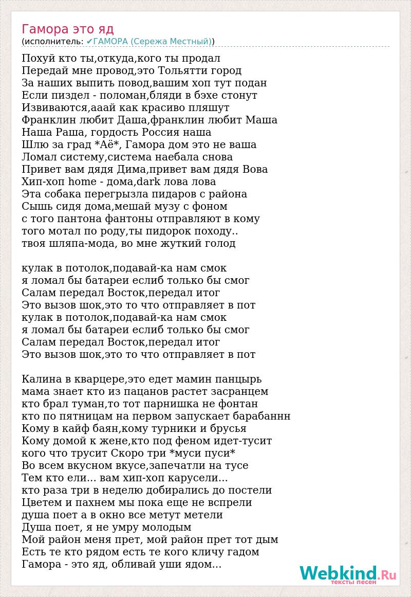 Похуй кто ты,откуда,кого ты продал Передай мне провод,это Тольятти город За наших выпить повод,вашим хоп тут подан Если пиздел - поломан,бляди в бэхе стонут Извиваются,ааай как красиво пляшут Франклин любит Даша,франклин любит Маша Наша Раша, гордость Россия наша Шлю за град *Аё*, Гамора дом это не ваша Ломал систему,система наебала снова Привет вам дядя Дима,привет вам дядя Вова Хип-хоп homе - дома,dark лова лова Эта собака перегрызла пидаров с района Сышь сидя дома,мешай музу с фоном с того пантона фантоны отправляют в кому того мотал по роду,ты пидорок походу.. твоя шляпа-мода, во мне жуткий голод кулак в потолок,подавай-ка нам смок я ломал бы батареи еслиб только бы смог Салам передал Восток,передал итог Это вызов шок,это то что отправляет в пот кулак в потолок,подавай-ка нам смок я ломал бы батареи еслиб только бы смог Салам передал Восток,передал итог Это вызов шок,это то что отправляет в пот Калина в кварцере,это едет мамин панцырь мама знает кто из пацанов растет засранцем кто брал туман,то тот парнишка не фонтан кто по пятницам на первом запускает барабаннн Кому в кайф баян,кому турники и брусья Кому домой к жене,кто под феном идет-тусит кого что трусит Скоро три *муси пуси* Во всем вкусном вкусе,запечатли на тусе Тем кто ели... вам хип-хоп карусели... кто раза три в неделю добирались до постели Цветем и пахнем мы пока еще не вспрели душа поет а в окно все метут метели Душа поет, я не умру молодым Мой район меня прет, мой район прет тот дым Есть те кто рядом есть те кого кличу гадом Гамора - это яд, обливай уши ядом...