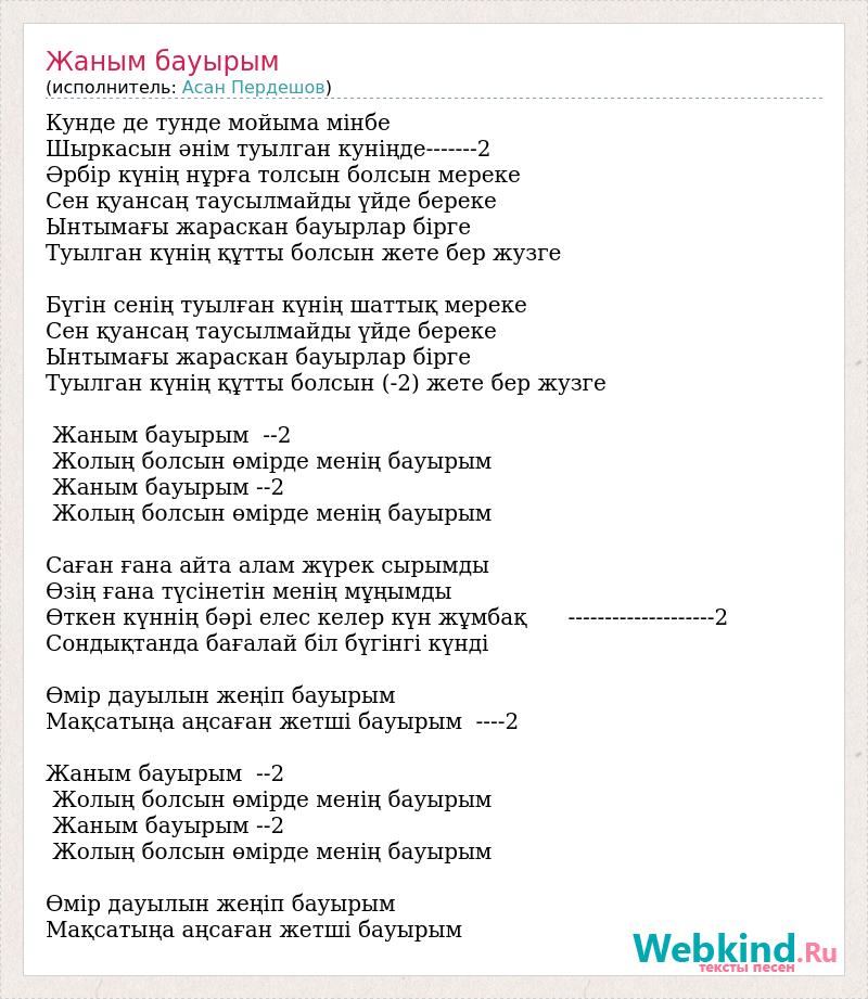 Кунде де тунде мойыма мінбе Шыркасын әнім туылган куніңде-------2 Әрбір күнің нұрға толсын болсын мереке Сен қуансаң таусылмайды үйде береке Ынтымағы жараскан бауырлар бірге Туылган күнің құтты болсын жете бер жузге Бүгін сенің туылған күнің шаттық мереке Сен қуансаң таусылмайды үйде береке Ынтымағы жараскан бауырлар бірге Туылган күнің құтты болсын (-2) жете бер жузге Жаным бауырым --2 Жолың болсын өмірде менің бауырым Жаным бауырым --2 Жолың болсын өмірде менің бауырым Саған ғана айта алам жүрек сырымды Өзің ғана түсінетін менің мұңымды Өткен күннің бәрі елес келер күн жұмбақ --------------------2 Сондықтанда бағалай біл бүгінгі күнді Өмір дауылын жеңіп бауырым Мақсатыңа аңсаған жетші бауырым ----2 Жаным бауырым --2 Жолың болсын өмірде менің бауырым Жаным бауырым --2 Жолың болсын өмірде менің бауырым Өмір дауылын жеңіп бауырым Мақсатыңа аңсаған жетші бауырым