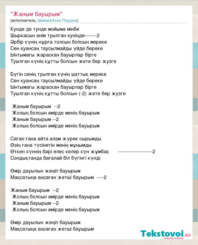 Кунде де тунде мойыма мінбе Шыркасын әнім туылган куніңде-------2 Әрбір күнің нұрға толсын болсын мереке Сен қуансаң таусылмайды үйде береке Ынтымағы жараскан бауырлар бірге Туылган күнің құтты болсын жете бер жузге Бүгін сенің туылған күнің шаттық мереке Сен қуансаң таусылмайды үйде береке Ынтымағы жараскан бауырлар бірге Туылган күнің құтты болсын (-2) жете бер жузге Жаным бауырым --2 Жолың болсын өмірде менің бауырым Жаным бауырым --2 Жолың болсын өмірде менің бауырым Саған ғана айта алам жүрек сырымды Өзің ғана түсінетін менің мұңымды Өткен күннің бәрі елес келер күн жұмбақ --------------------2 Сондықтанда бағалай біл бүгінгі күнді Өмір дауылын жеңіп бауырым Мақсатыңа аңсаған жетші бауырым ----2 Жаным бауырым --2 Жолың болсын өмірде менің бауырым Жаным бауырым --2 Жолың болсын өмірде менің бауырым Өмір дауылын жеңіп бауырым Мақсатыңа аңсаған жетші бауырым