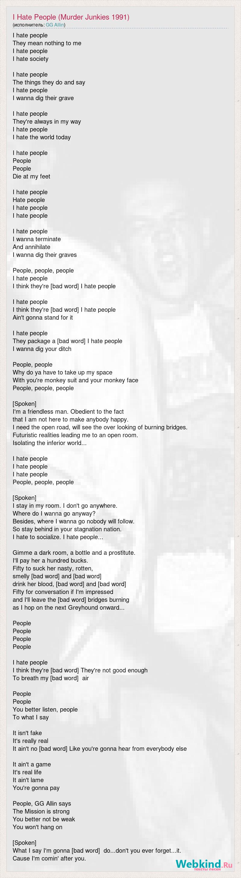 I hate people They mean nothing to me I hate people I hate society I hate people The things they do and say I hate people I wanna dig their grave I hate people They're always in my way I hate people I hate the world today I hate people People People Die at my feet I hate people Hate people I hate people I hate people I hate people I wanna terminate And annihilate I wanna dig their graves People, people, people I hate people I think they're [bad word] I hate people I hate people I think they're [bad word] I hate people Ain't gonna stand for it I hate people They package a [bad word] I hate people I wanna dig your ditch People, people Why do ya have to take up my space With you're monkey suit and your monkey face People, people, people [Spoken] I'm a friendless man. Obedient to the fact that I am not here to make anybody happy. I need the open road, will see the over looking of burning bridges. Futuristic realities leading me to an open room. Isolating the inferior world... I hate people I hate people I hate people People, people, people [Spoken] I stay in my room. I don't go anywhere. Where do I wanna go anyway? Besides, where I wanna go nobody will follow. So stay behind in your stagnation nation. I hate to socialize. I hate people... Gimme a dark room, a bottle and a prostitute. I'll pay her a hundred bucks. Fifty to suck her nasty, rotten, smelly [bad word] and [bad word] drink her blood, [bad word] and [bad word] Fifty for conversation if I'm impressed and I'll leave the [bad word] bridges burning as I hop on the next Greyhound onward... People People People People I hate people I think they're [bad word] They're not good enough To breath my [bad word] air People People You better listen, people To what I say It isn't fake It's really real It ain't no [bad word] Like you're gonna hear from everybody else It ain't a game It's real life It ain't lame You're gonna pay People, GG Allin says The Mission is strong You better not be weak You won't hang on [Spoken] What I say I'm gonna [bad word] do...don't you ever forget...it. Cause I'm comin' after you.