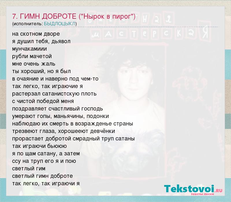 на скотном дворе я душил тебя, дьявол мунчакамиии рубли мачетой мне очень жаль ты хороший, но я был в очаяние и наверно под чем-то так легко, так играючие я растерзал сатанистскую плоть с чистой победой меня поздравляет счастливый господь умерают гопы, маньячины, подонки наблюдаю их смерть в возражденье страны трезвеют глаза, хорошееют девчёнки прорастает добротой смрадный труп сатаны так играючи бьююю я по щам сатану, а затем ссу на труп его я и пою светлый гим светлый гимн доброте так легко, так играючи я