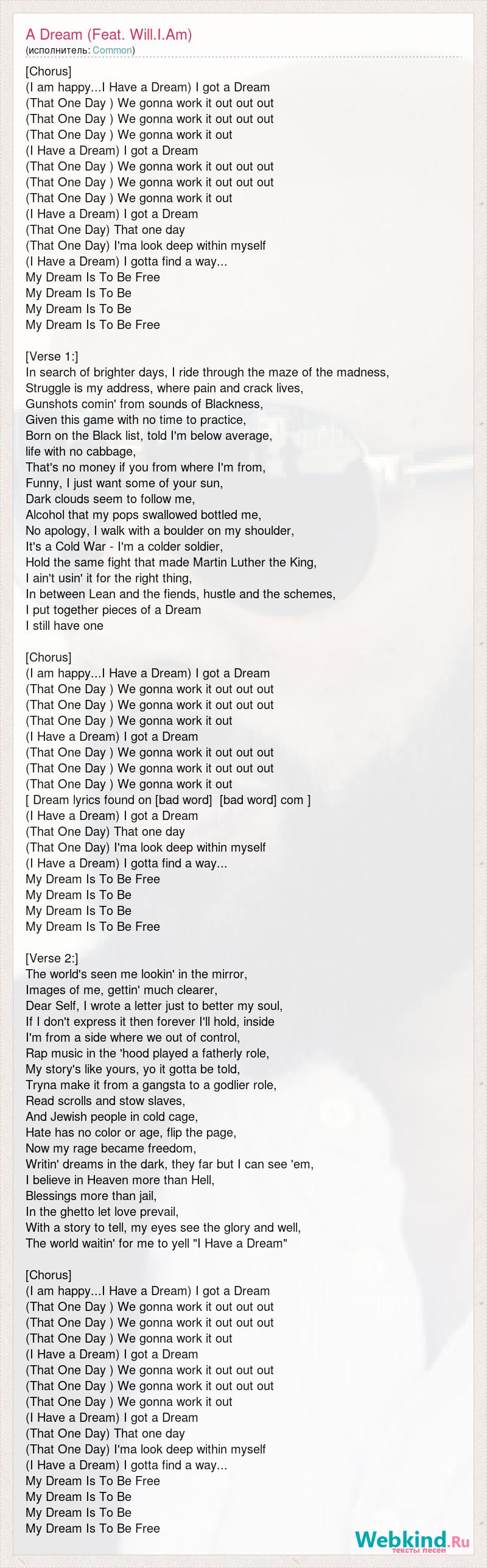 [Chorus] (I am happy...I Have a Dream) I got a Dream (That One Day ) We gonna work it out out out (That One Day ) We gonna work it out out out (That One Day ) We gonna work it out (I Have a Dream) I got a Dream (That One Day ) We gonna work it out out out (That One Day ) We gonna work it out out out (That One Day ) We gonna work it out (I Have a Dream) I got a Dream (That One Day) That one day (That One Day) I'ma look deep within myself (I Have a Dream) I gotta find a way... My Dream Is To Be Free My Dream Is To Be My Dream Is To Be My Dream Is To Be Free [Verse 1:] In search of brighter days, I ride through the maze of the madness, Struggle is my address, where pain and crack lives, Gunshots comin' from sounds of Blackness, Given this game with no time to practice, Born on the Black list, told I'm below average, life with no cabbage, That's no money if you from where I'm from, Funny, I just want some of your sun, Dark clouds seem to follow me, Alcohol that my pops swallowed bottled me, No apology, I walk with a boulder on my shoulder, It's a Cold War - I'm a colder soldier, Hold the same fight that made Martin Luther the King, I ain't usin' it for the right thing, In between Lean and the fiends, hustle and the schemes, I put together pieces of a Dream I still have one [Chorus] (I am happy...I Have a Dream) I got a Dream (That One Day ) We gonna work it out out out (That One Day ) We gonna work it out out out (That One Day ) We gonna work it out (I Have a Dream) I got a Dream (That One Day ) We gonna work it out out out (That One Day ) We gonna work it out out out (That One Day ) We gonna work it out [ Dream lyrics found on [bad word] [bad word] com ] (I Have a Dream) I got a Dream (That One Day) That one day (That One Day) I'ma look deep within myself (I Have a Dream) I gotta find a way... My Dream Is To Be Free My Dream Is To Be My Dream Is To Be My Dream Is To Be Free [Verse 2:] The world's seen me lookin' in the mirror, Images of me, gettin' much clearer, Dear Self, I wrote a letter just to better my soul, If I don't express it then forever I'll hold, inside I'm from a side where we out of control, Rap music in the 'hood played a fatherly role, My story's like yours, yo it gotta be told, Tryna make it from a gangsta to a godlier role, Read scrolls and stow slaves, And Jewish people in cold cage, Hate has no color or age, flip the page, Now my rage became freedom, Writin' dreams in the dark, they far but I can see 'em, I believe in Heaven more than Hell, Blessings more than jail, In the ghetto let love prevail, With a story to tell, my eyes see the glory and well, The world waitin' for me to yell "I Have a Dream" [Chorus] (I am happy...I Have a Dream) I got a Dream (That One Day ) We gonna work it out out out (That One Day ) We gonna work it out out out (That One Day ) We gonna work it out (I Have a Dream) I got a Dream (That One Day ) We gonna work it out out out (That One Day ) We gonna work it out out out (That One Day ) We gonna work it out (I Have a Dream) I got a Dream (That One Day) That one day (That One Day) I'ma look deep within myself (I Have a Dream) I gotta find a way... My Dream Is To Be Free My Dream Is To Be My Dream Is To Be My Dream Is To Be Free