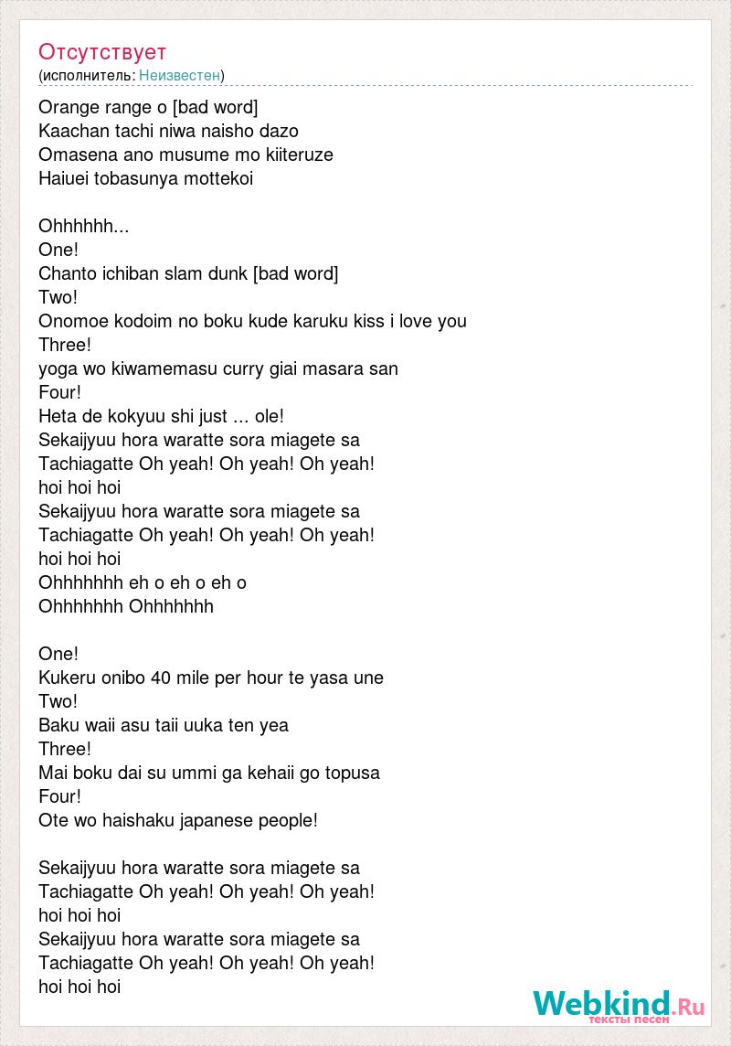 Orange range o [bad word] Kaachan tachi niwa naisho dazo Omasena ano musume mo kiiteruze Haiuei tobasunya mottekoi Ohhhhhh... One! Chanto ichiban slam dunk [bad word] Two! Onomoe kodoim no boku kude karuku kiss i love you Three! yoga wo kiwamemasu curry giai masara san Four! Heta de kokyuu shi just ... ole! Sekaijyuu hora waratte sora miagete sa Tachiagatte Oh yeah! Oh yeah! Oh yeah! hoi hoi hoi Sekaijyuu hora waratte sora miagete sa Tachiagatte Oh yeah! Oh yeah! Oh yeah! hoi hoi hoi Ohhhhhhh eh o eh o eh o Ohhhhhhh Ohhhhhhh One! Kukeru onibo 40 mile per hour te yasa une Two! Baku waii asu taii uuka ten yea Three! Mai boku dai su ummi ga kehaii go topusa Four! Ote wo haishaku japanese people! Sekaijyuu hora waratte sora miagete sa Tachiagatte Oh yeah! Oh yeah! Oh yeah! hoi hoi hoi Sekaijyuu hora waratte sora miagete sa Tachiagatte Oh yeah! Oh yeah! Oh yeah! hoi hoi hoi